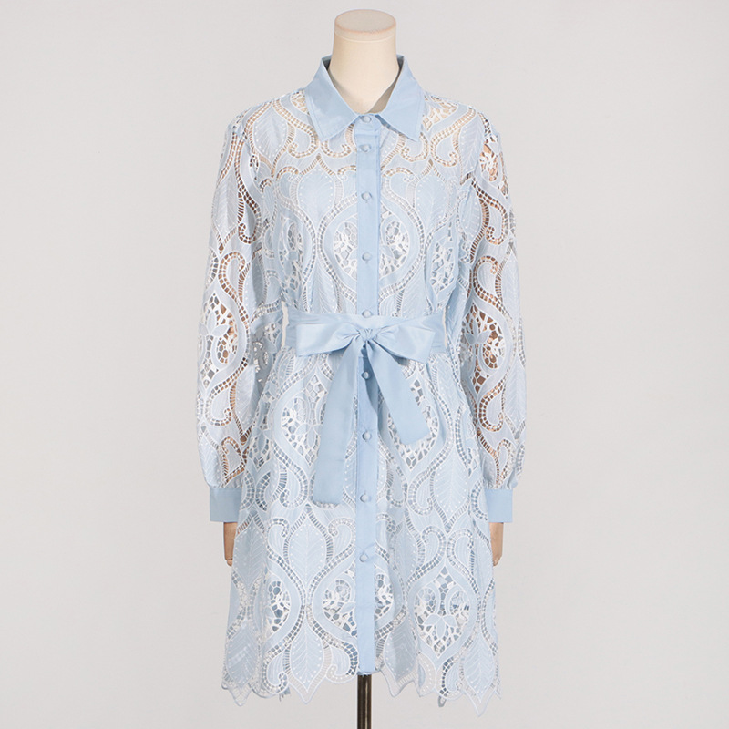 Summer Embroidered Polo Collar Lace-Up Asymmetric Dress
