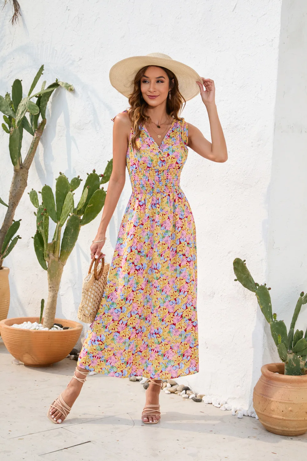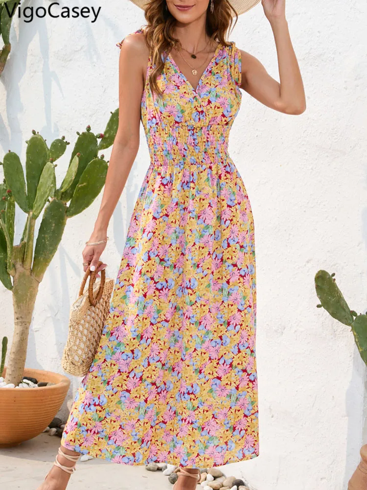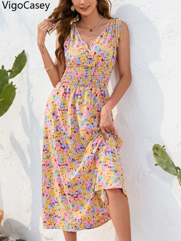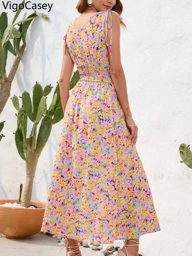 Summer Floral Print V-Neck Long Dress with Tie Straps”