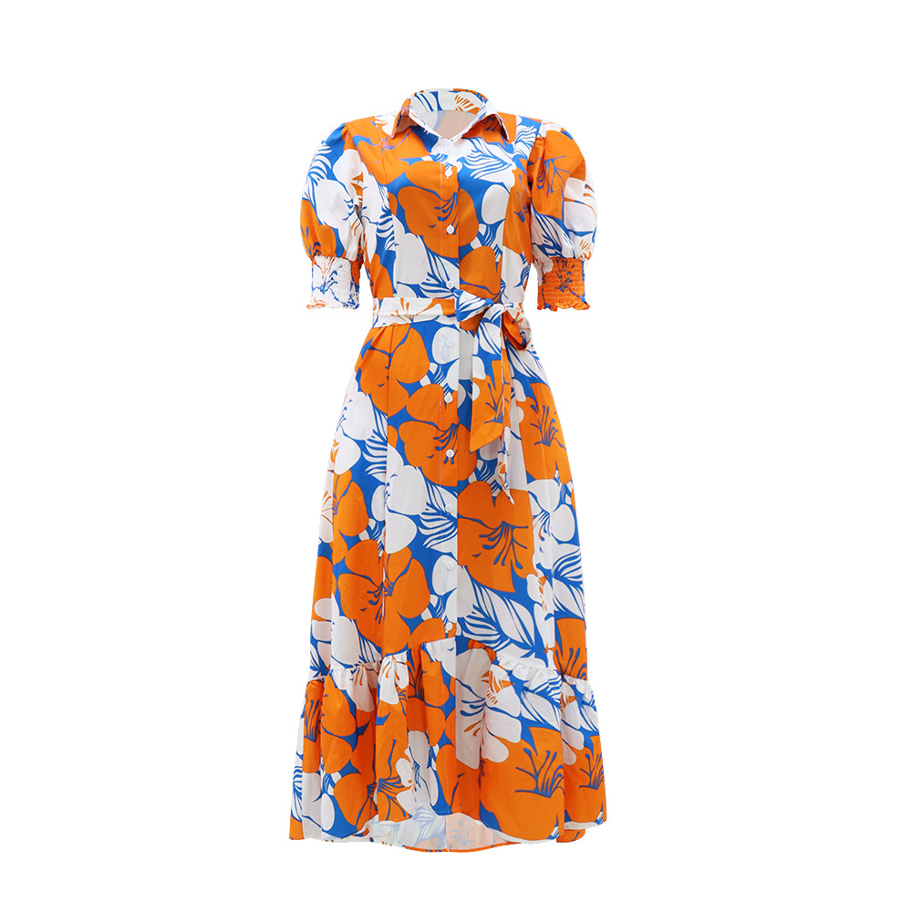 Summer Printed Polo Collar Lace-Up Waist Dress