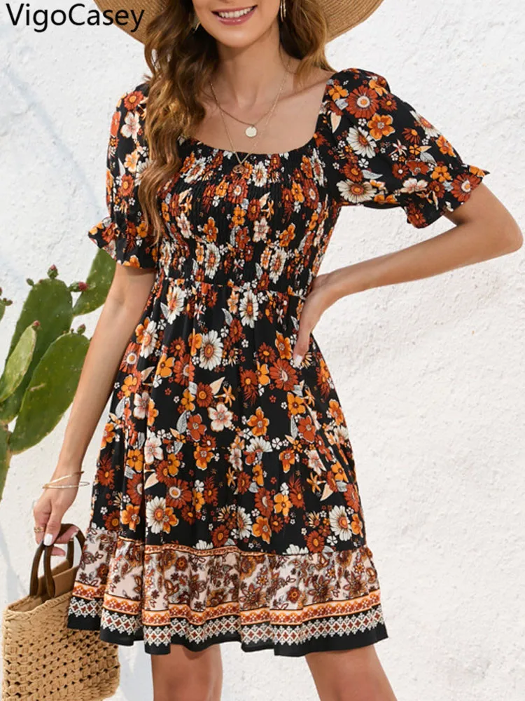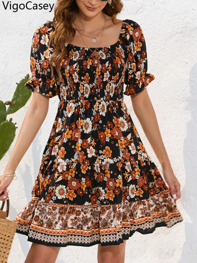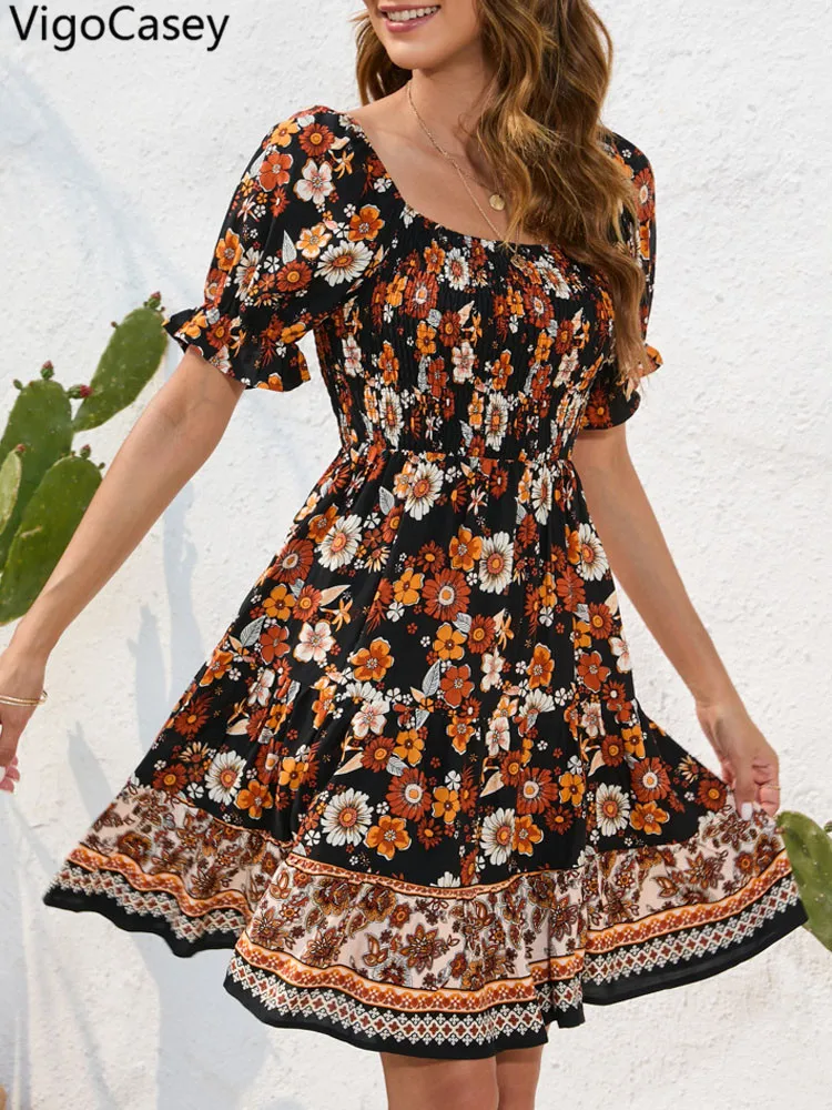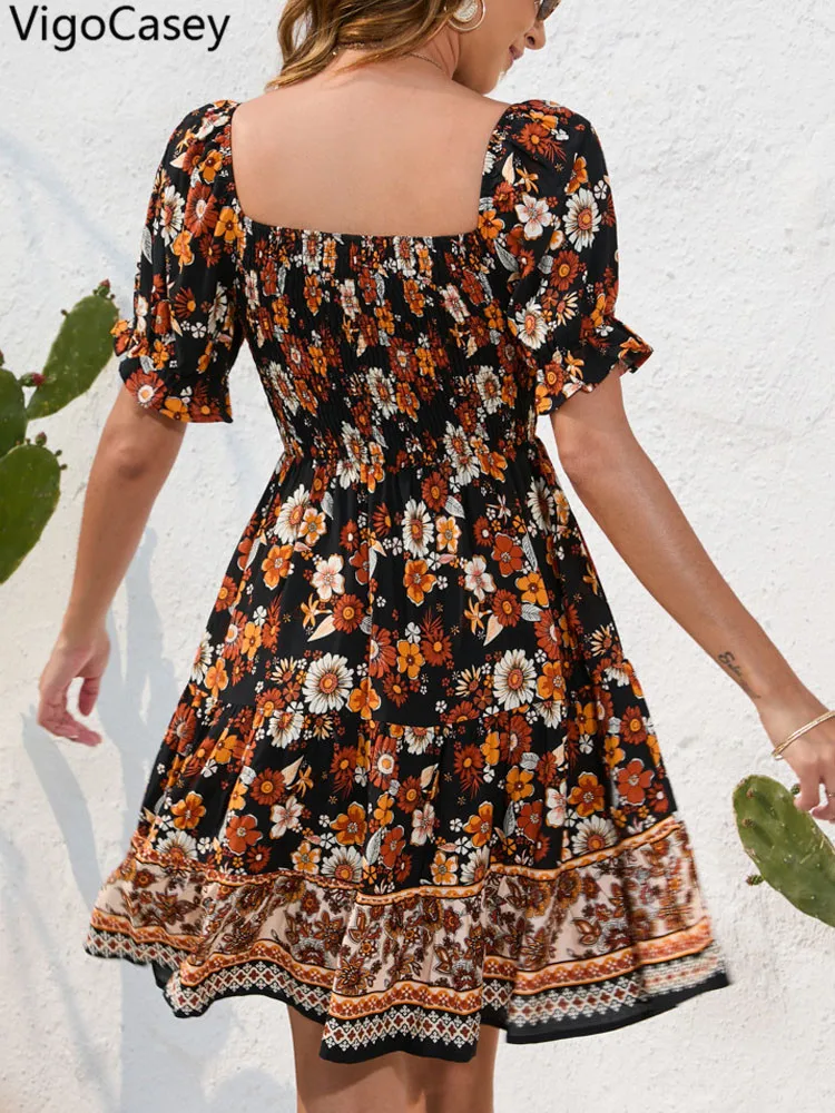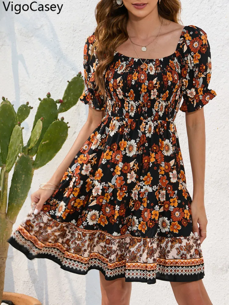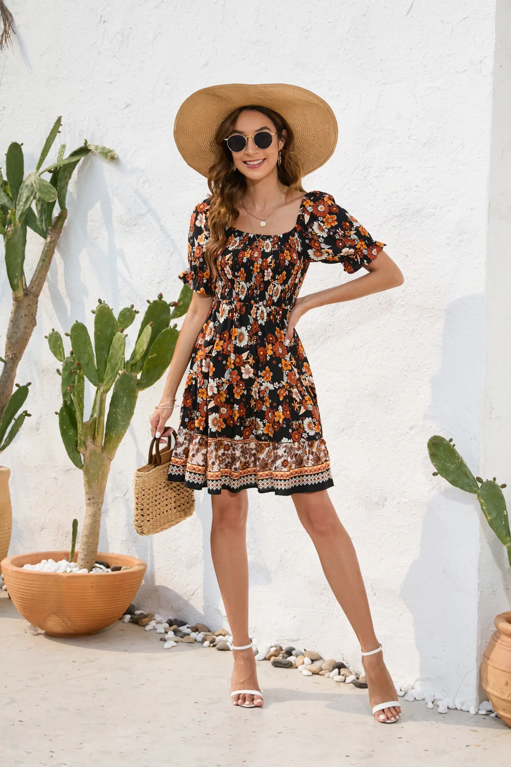 Summer Puff Sleeve Square Neck Print Mini Dress for Women
