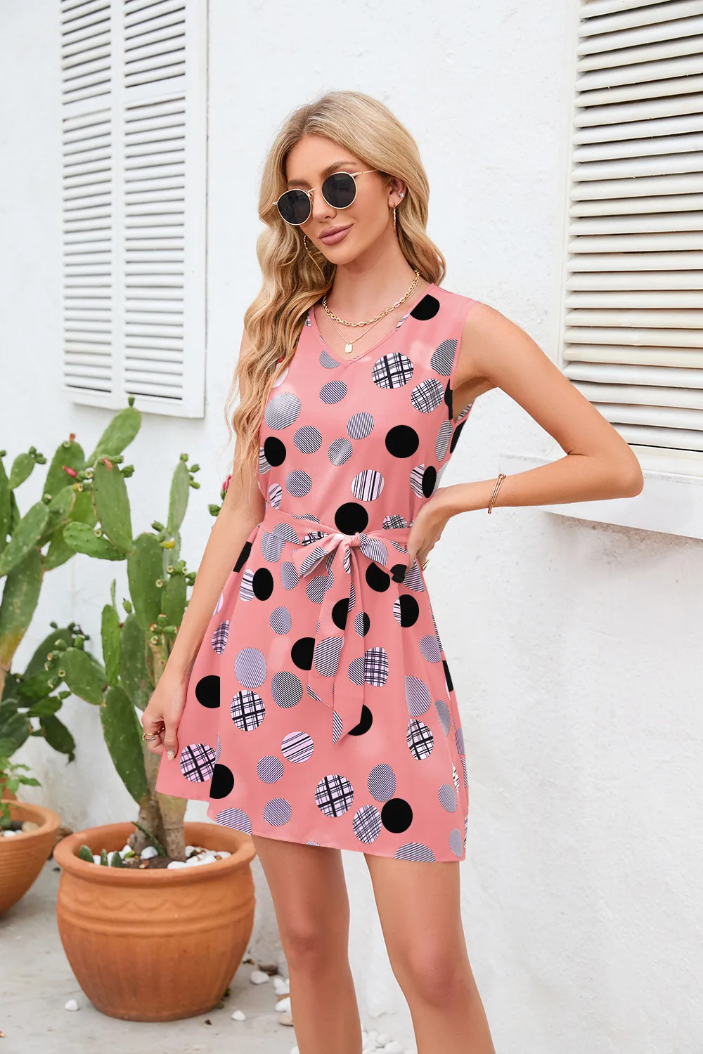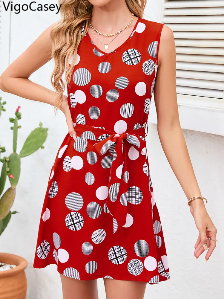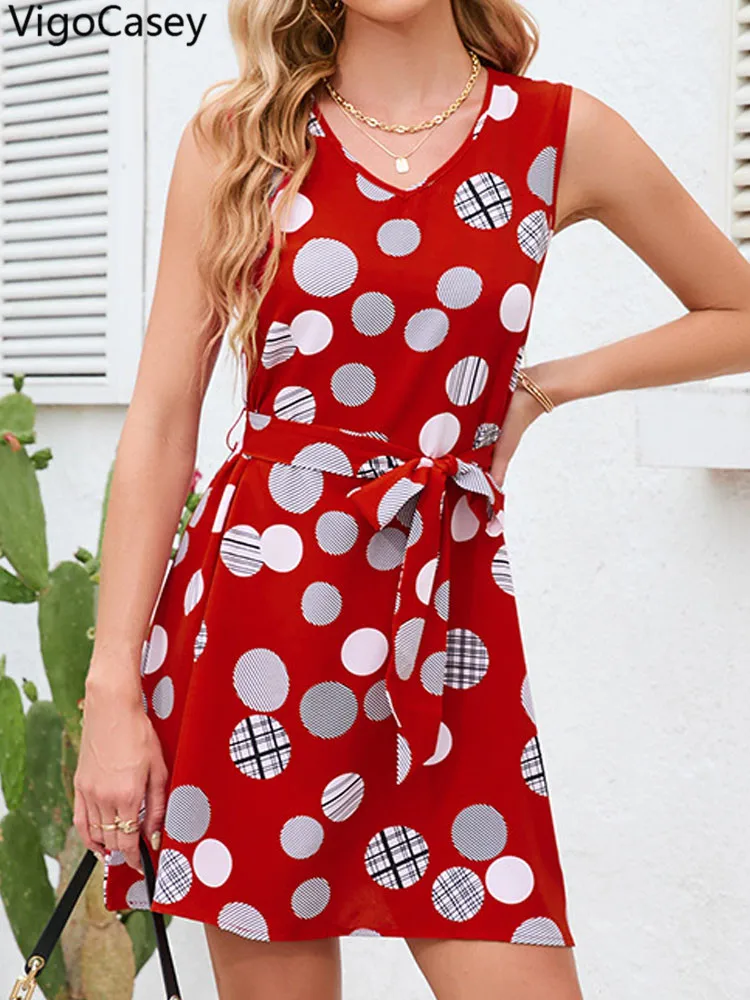 Summer Sleeveless V-Neck Polka Dot Mini Dress with Belt
