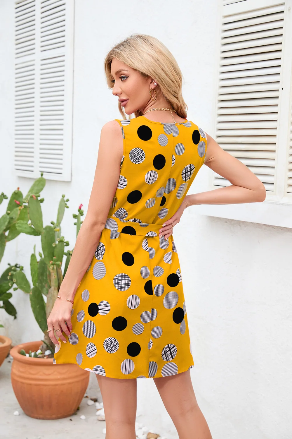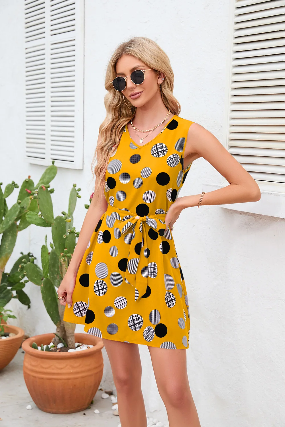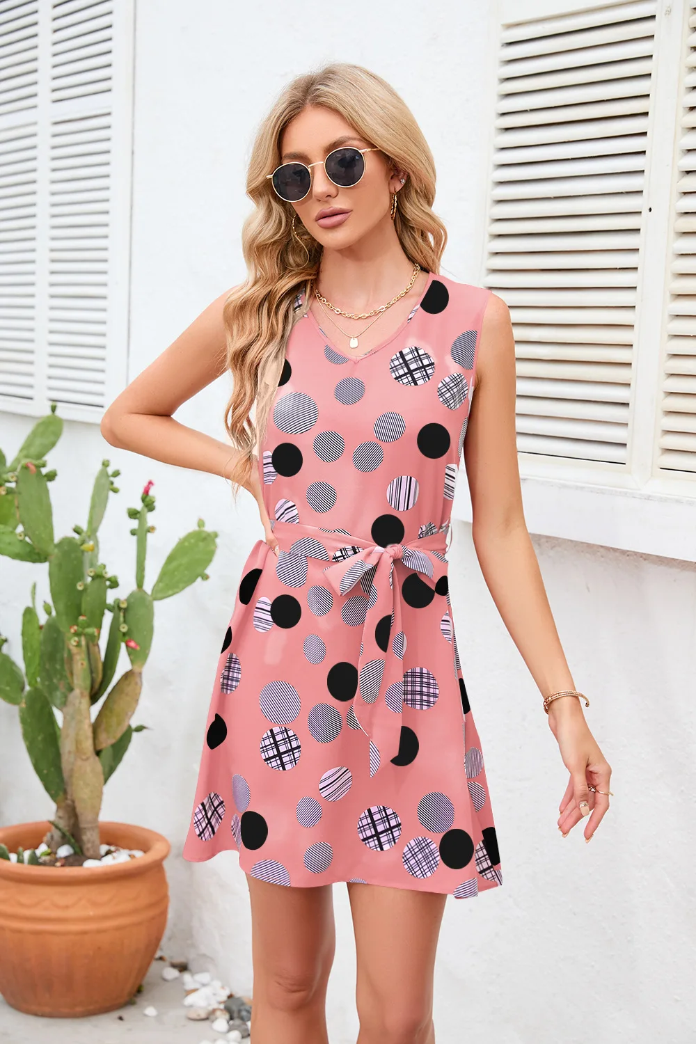 Summer Sleeveless V-Neck Polka Dot Mini Dress with Belt