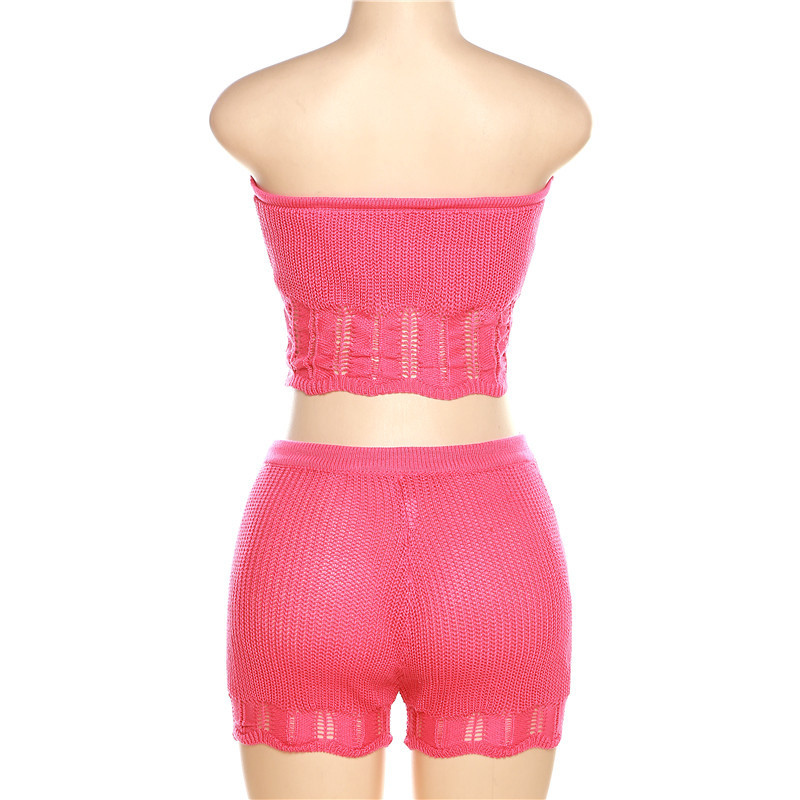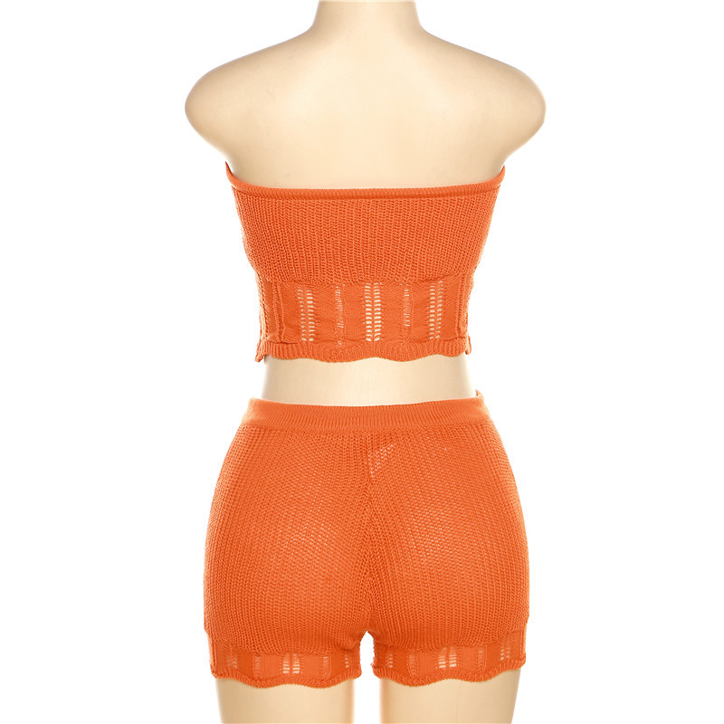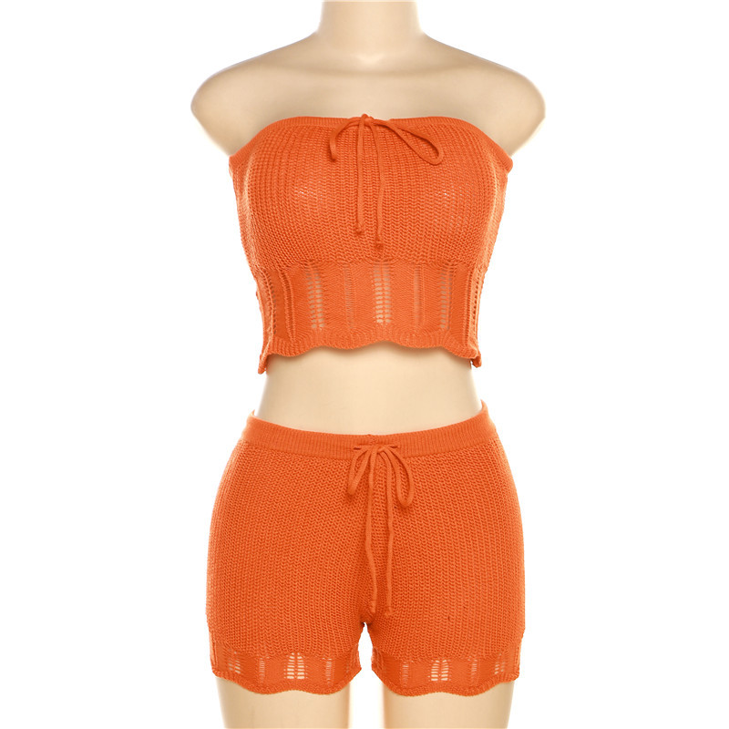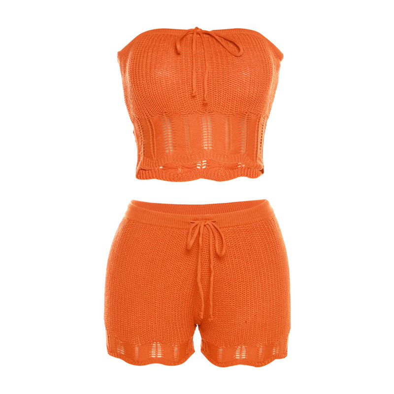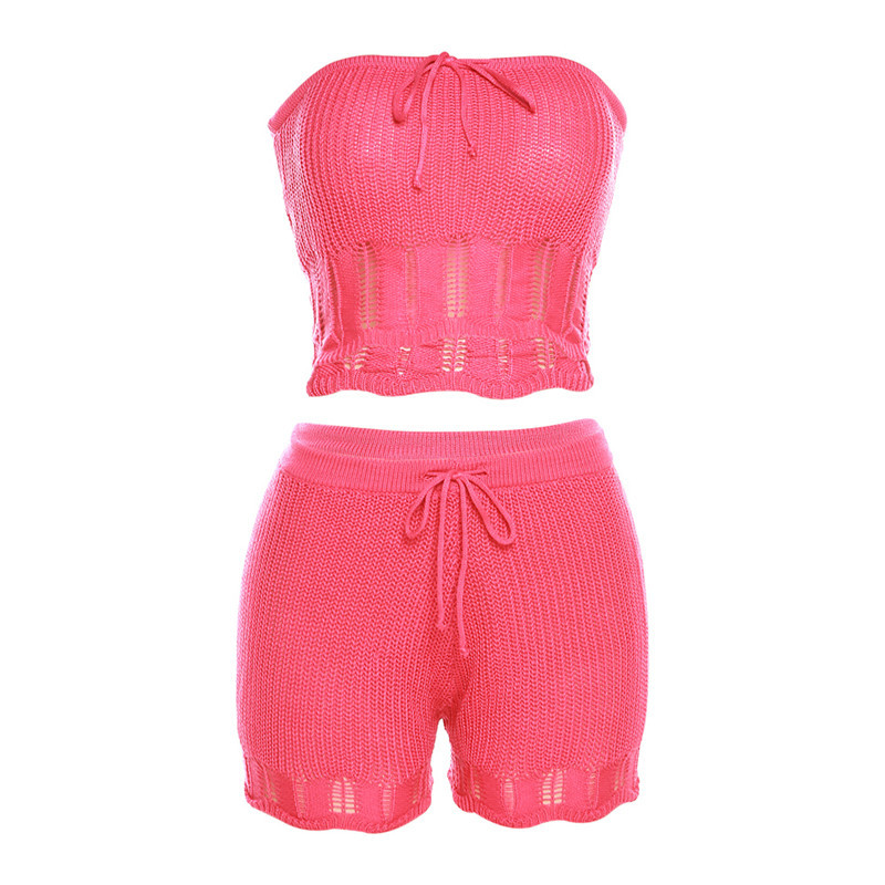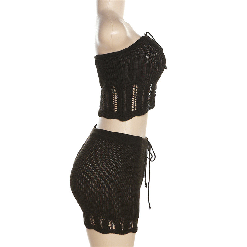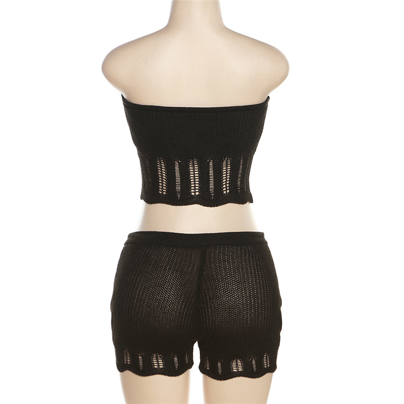 Summer Women Clothing Fashionable Knitted Hollow Out Cutout Chest Wrap Small Vest Slim High Waist Shorts Suit