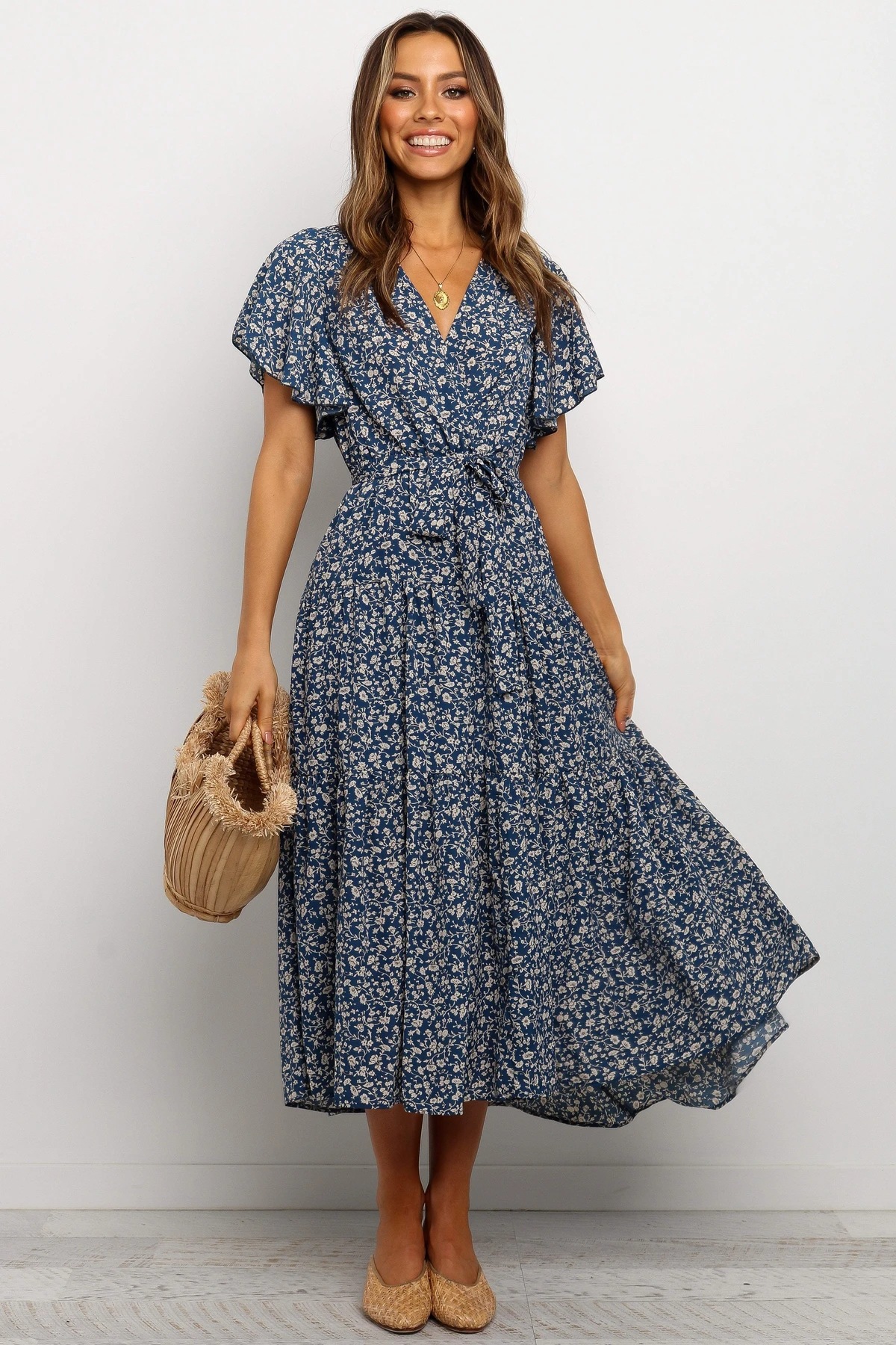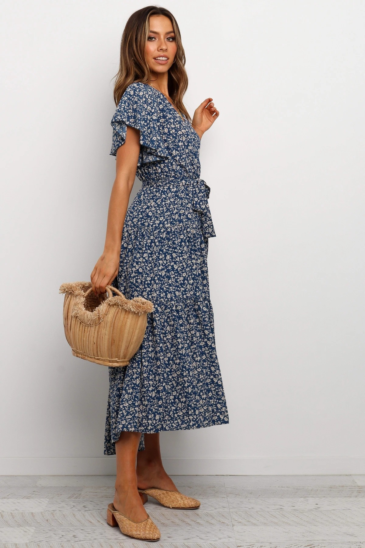 Summer Women V Neck Short Sleeve Ruffled Large Swing High Waist Tie Shoulder Floral Chiffon Dress Long Dress