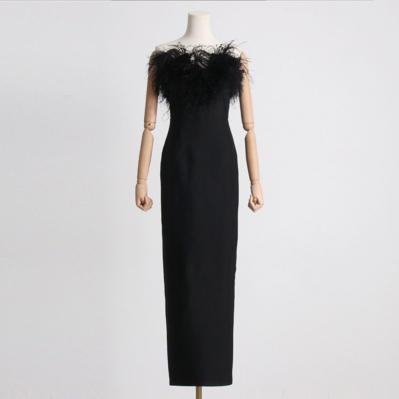 Tube Top Ostrich Feather Slim Patchwork Dress