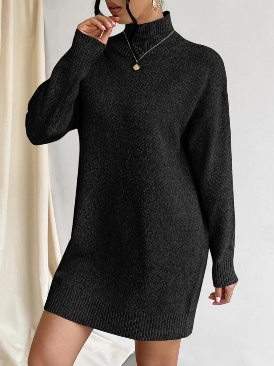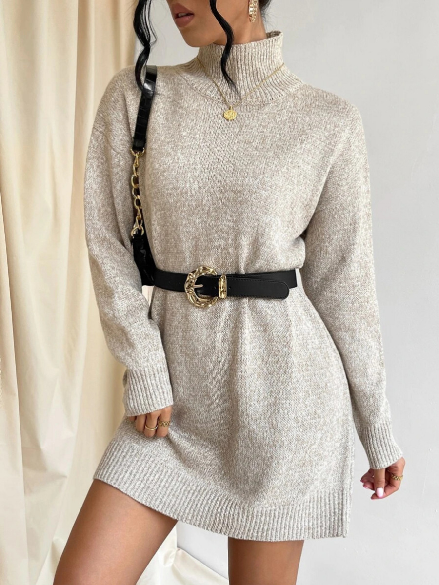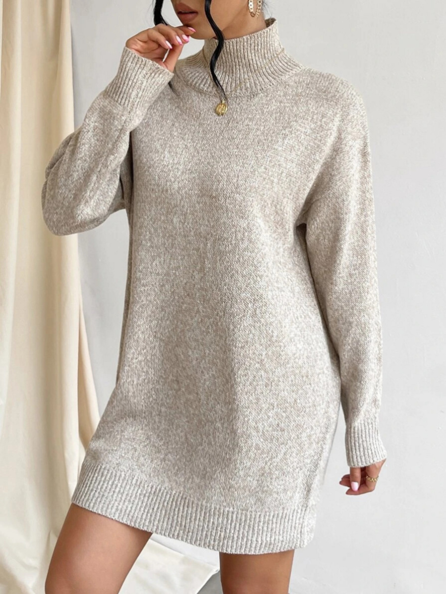Turtleneck Knitting Dress Solid Color Simple Pullover Sweater Midi Dress