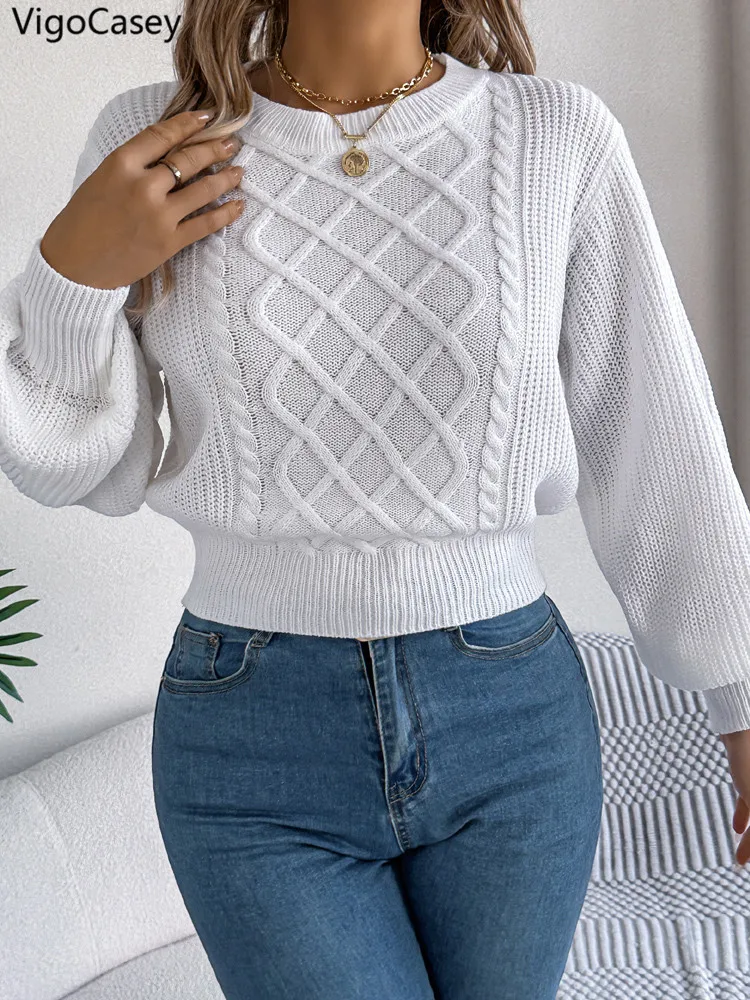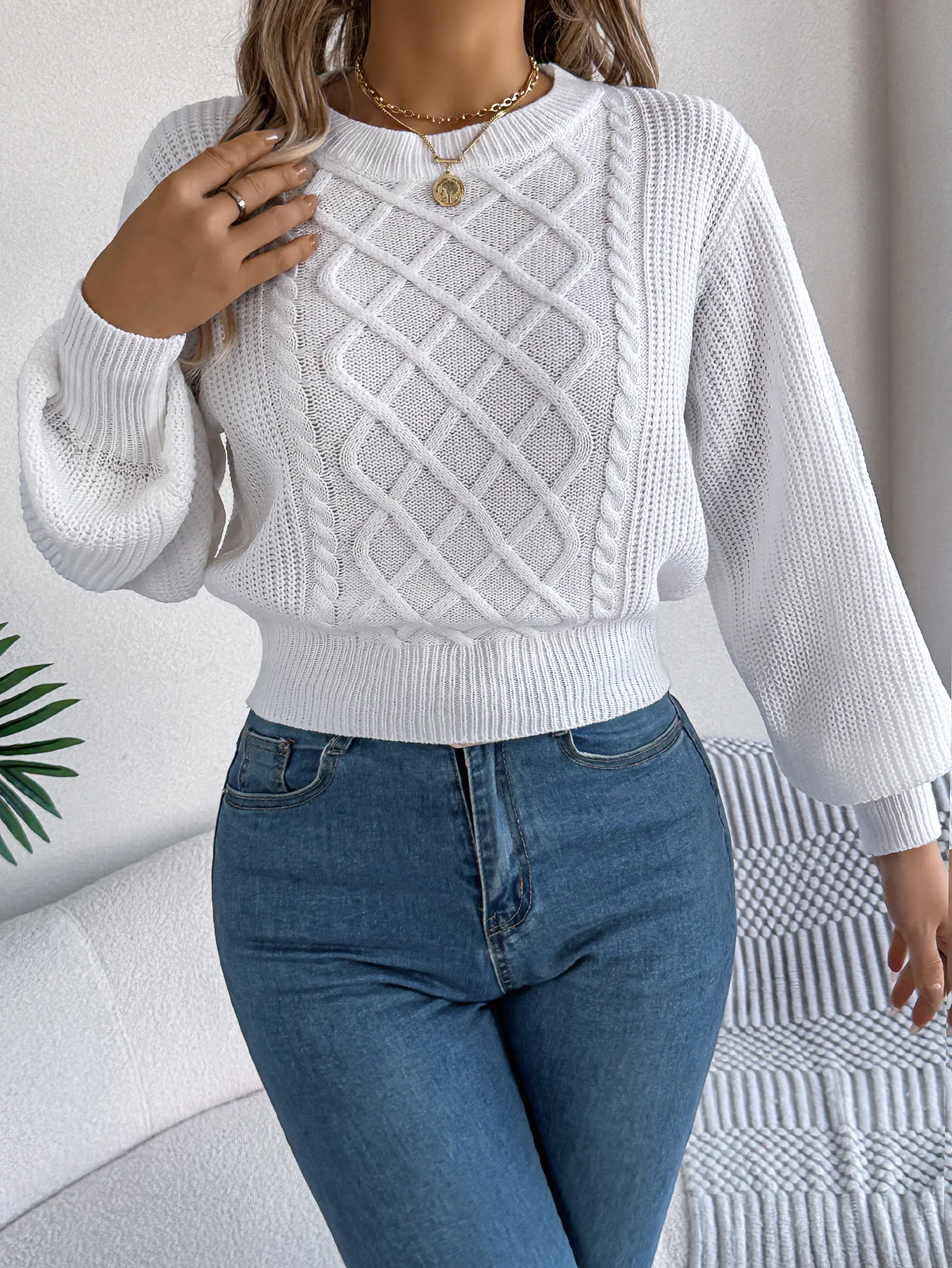 White Knit Lantern Sleeve Sweater