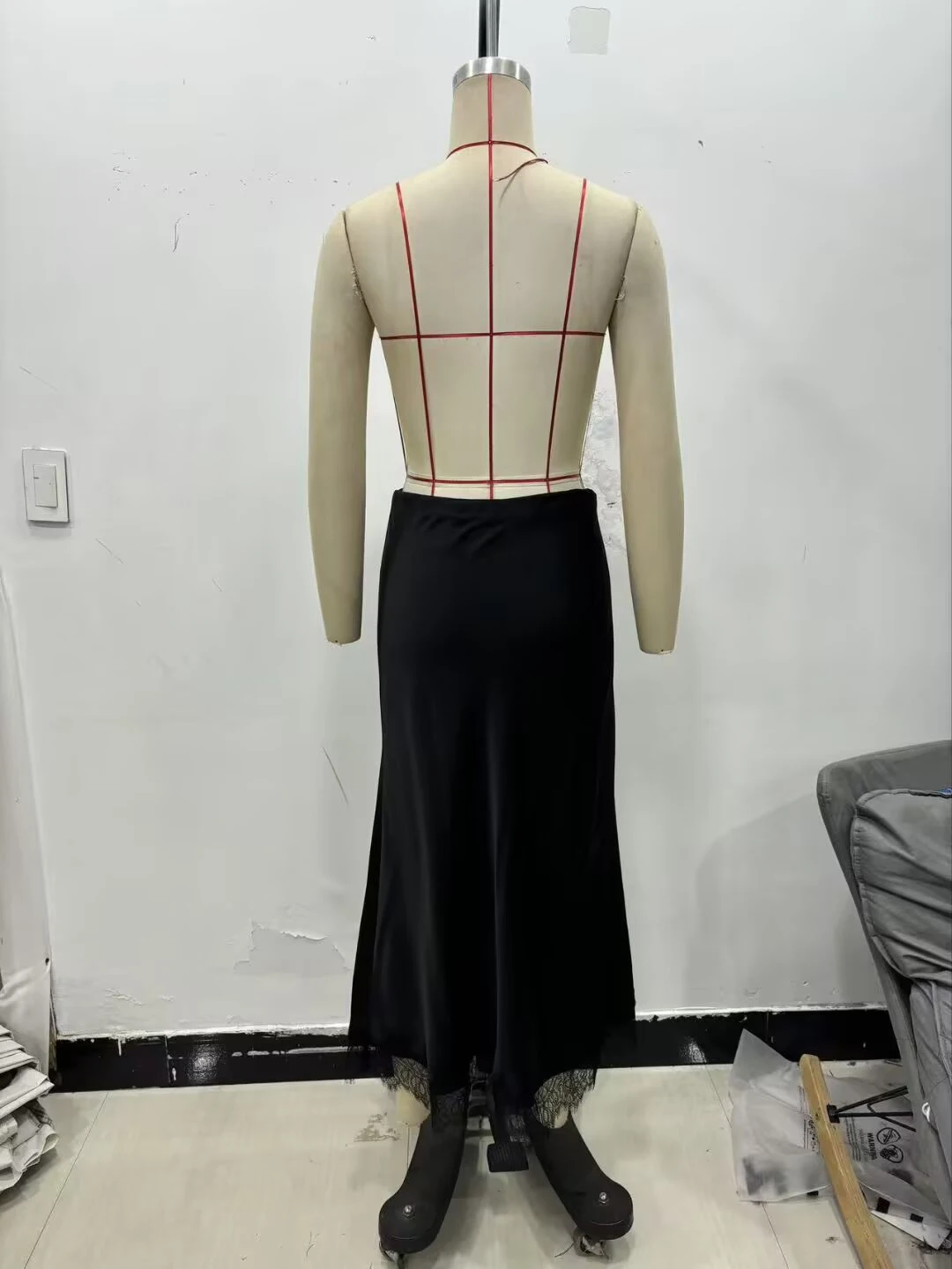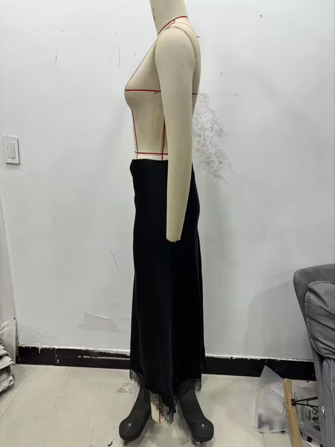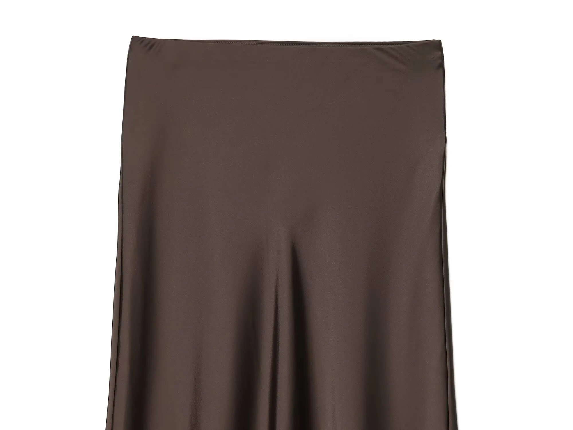 Winter Women’s High-Waist Lace Trim Silk Midi Skirt