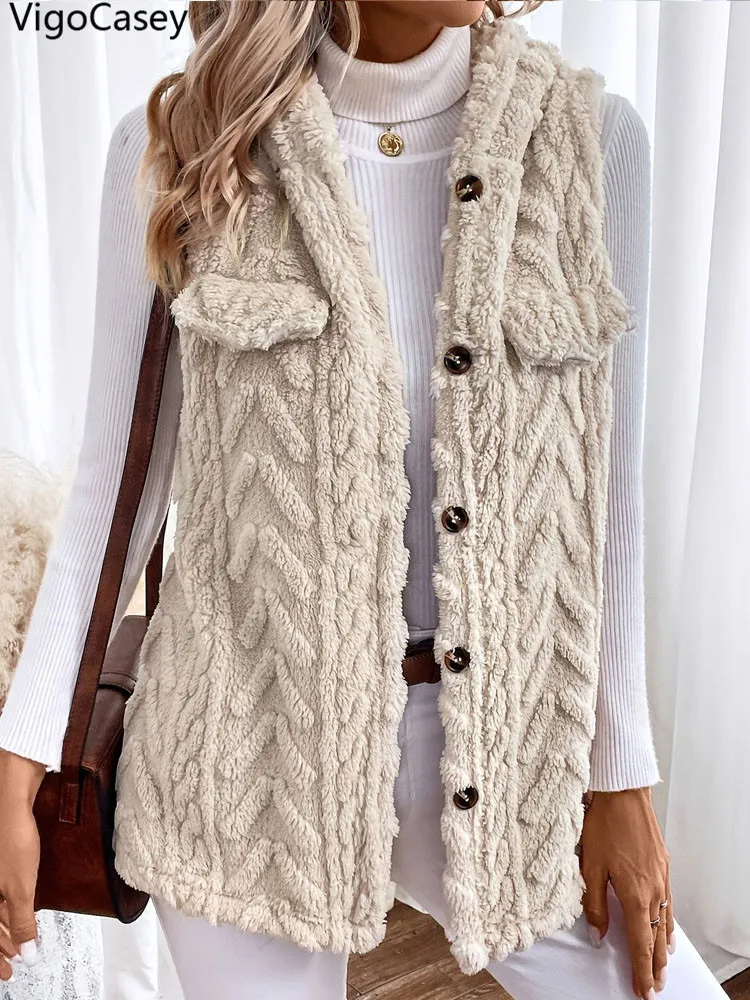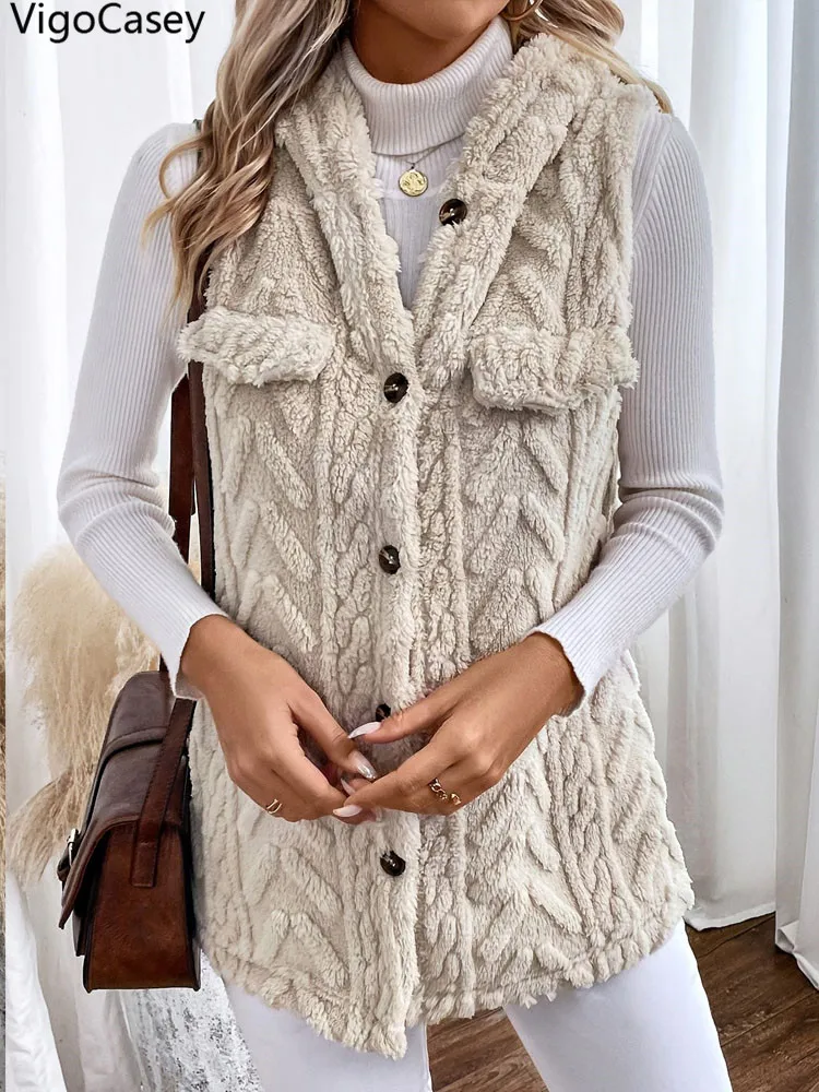 Women Apricot Plush Vest Cozy Hooded Single Breasted Winter Coat