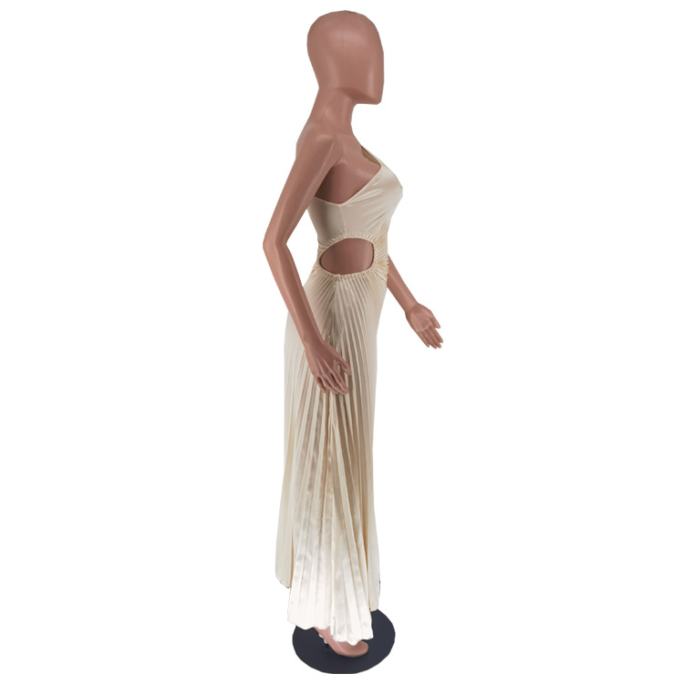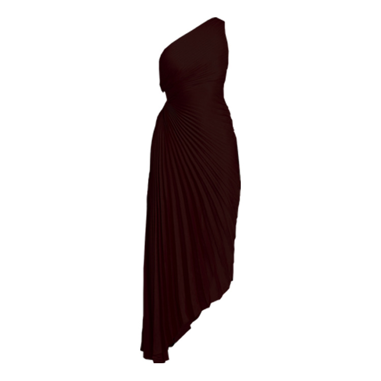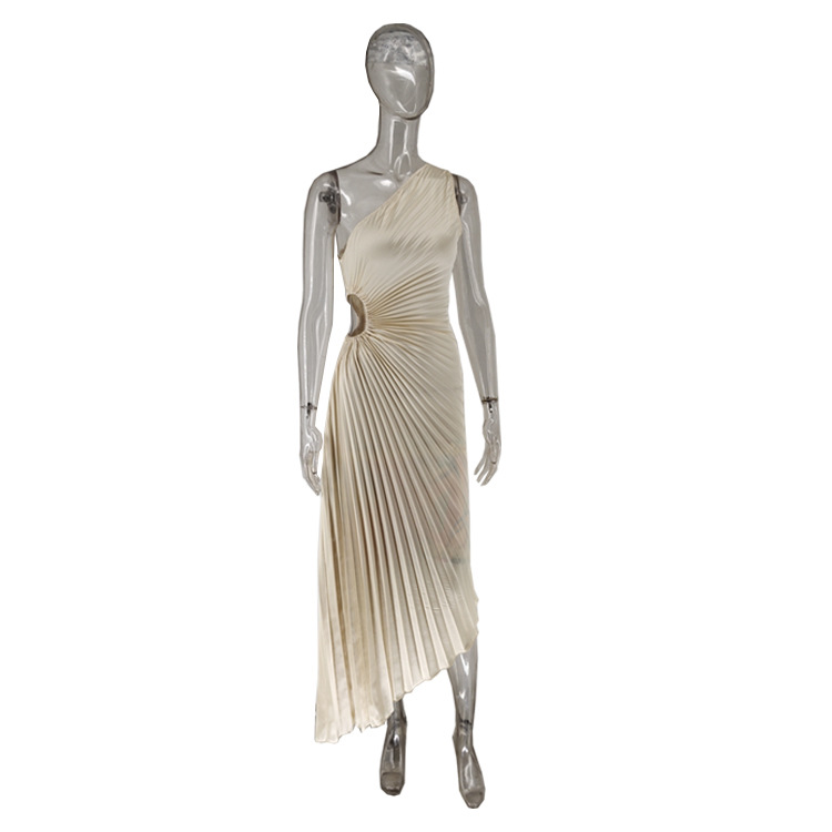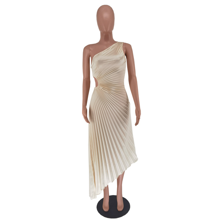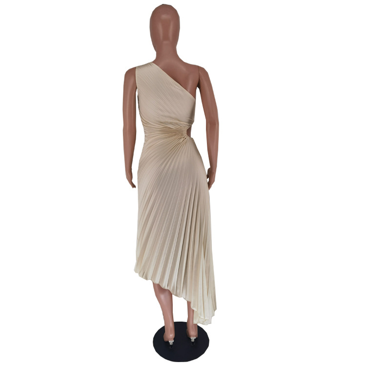Women Clothing One Shoulder Diagonal Collar Pleated Hollow Out Cutout Dress