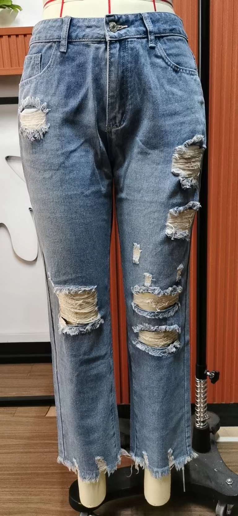 Denim With Hole Fifth Pants Fashionable Frayed Hem Tasseled Jeans Women