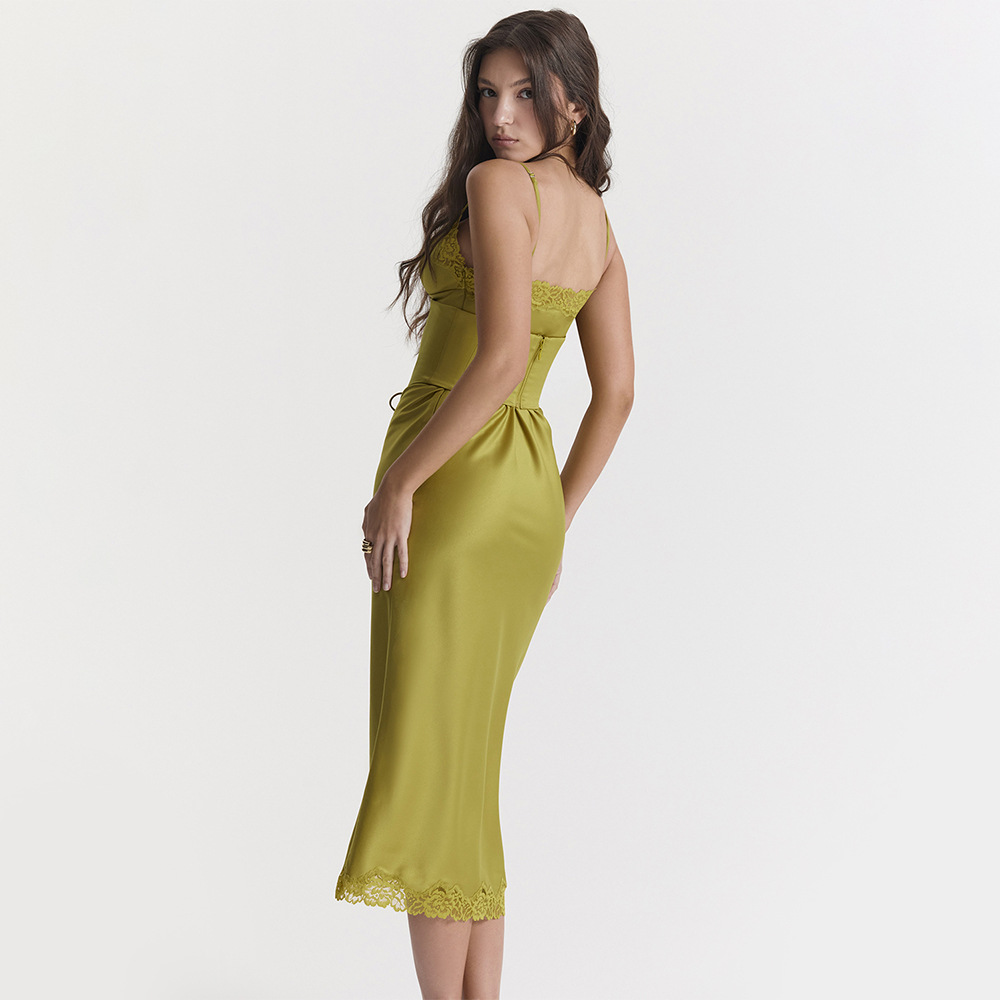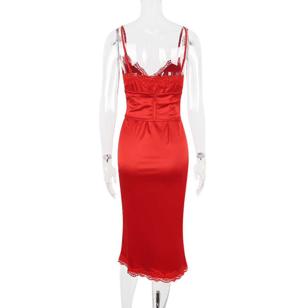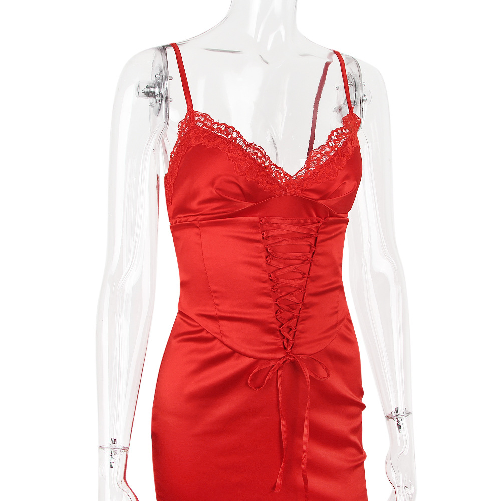 Women Clothing Satin Lace Slim Fit Patchwork Backless Dress Sexy Strap Dress