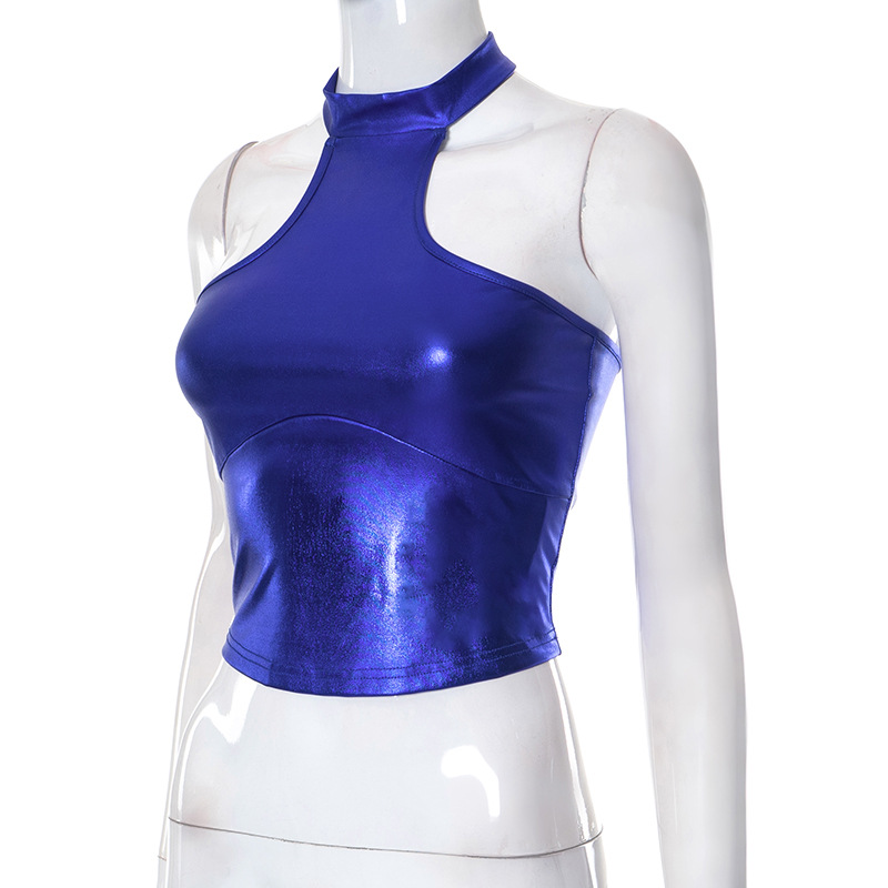 Women Clothing Spring Summer round Neck Sleeveless Glossy Short Backless Sexy T shirt