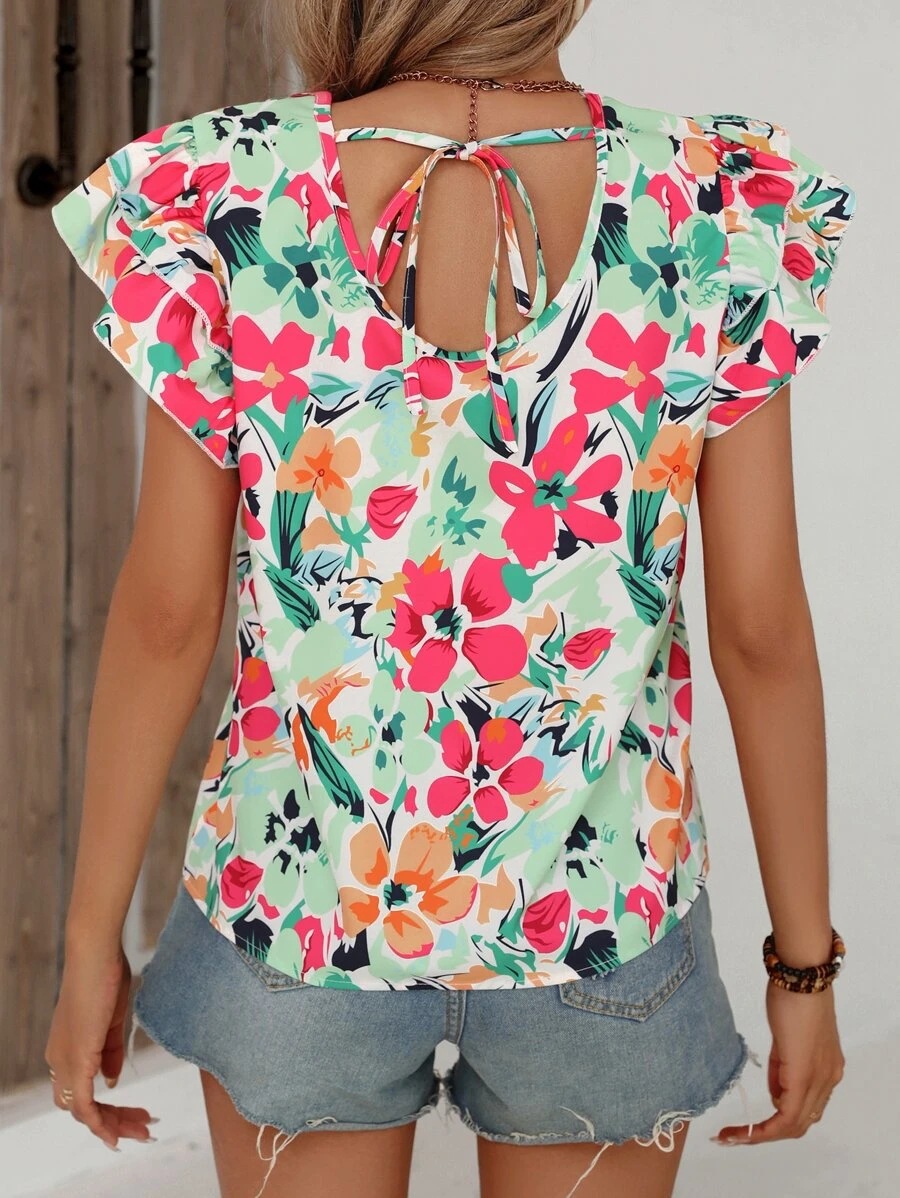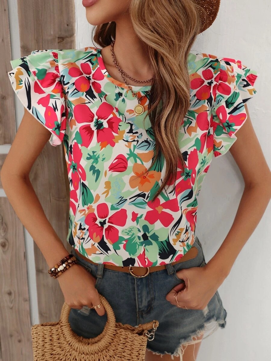 Women Clothing Summer Floral Print Double Layer Flying Short Sleeve Shirt Women