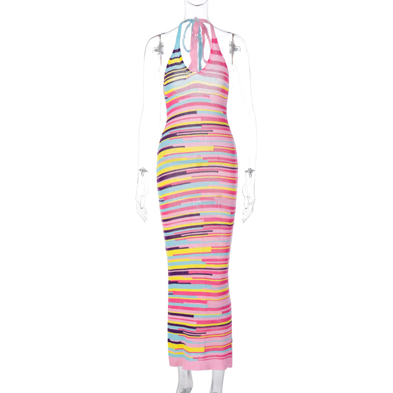 Women Clothing Summer Pattern Print V neck Backless Lace up Woolen Dress
