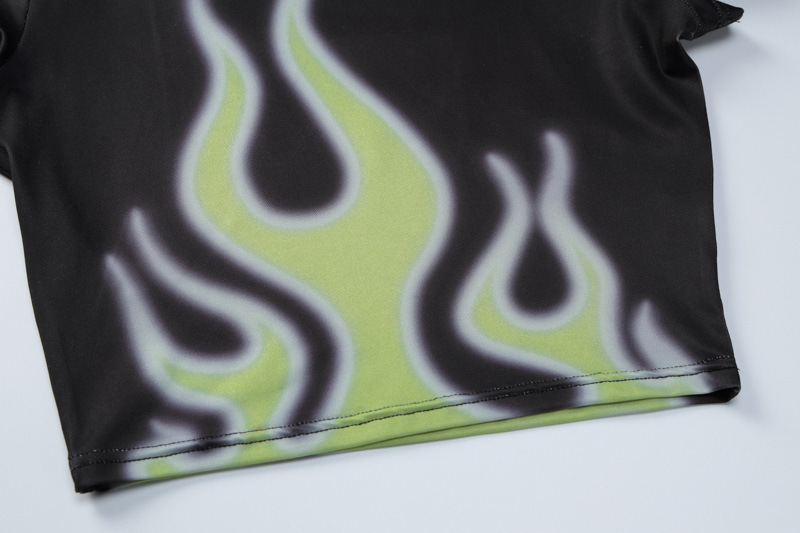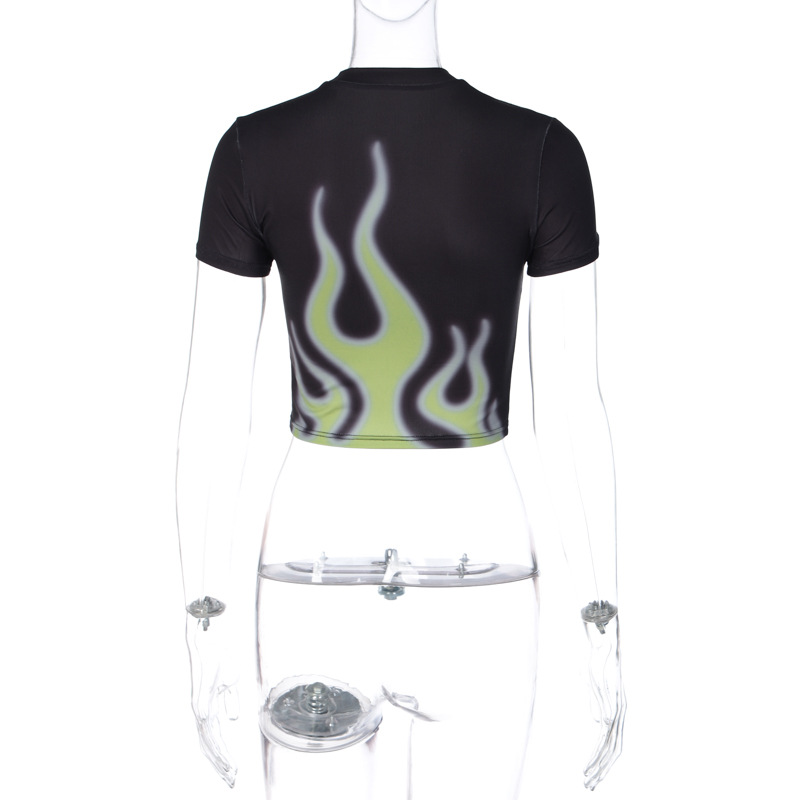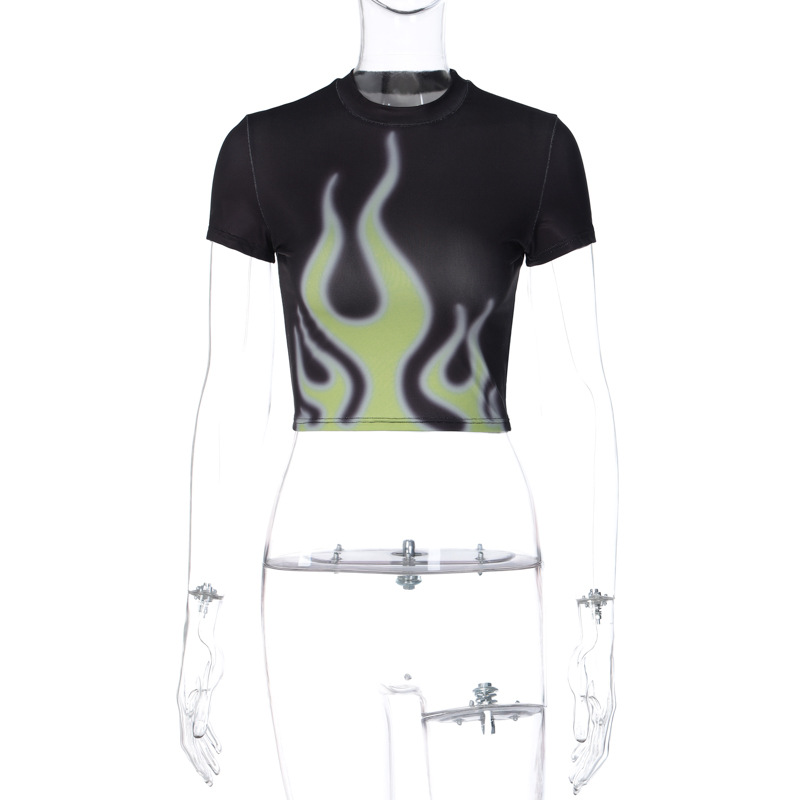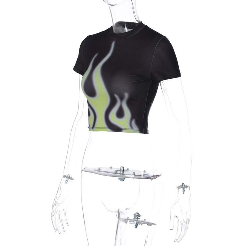 Women Clothing Summer Printing Bare Cropped Slim Fit Short Crew Neck T shirt Top
