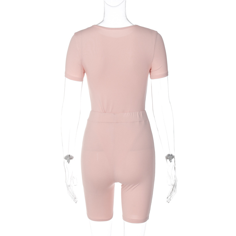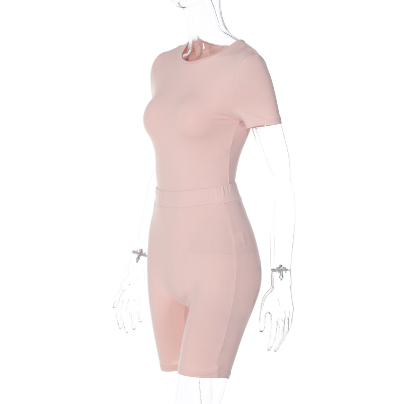 Women Clothing Summer round Neck Short Sleeve Rompers Slim Solid Color Shorts Set