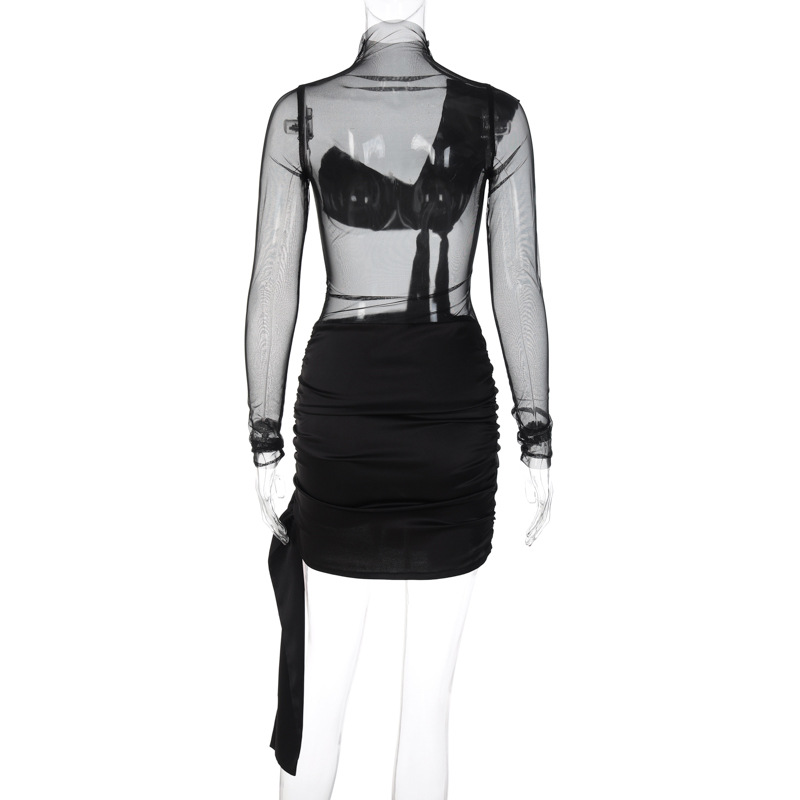 Women Clothing Summer Sexy Mesh Stitching Sheer Long Sleeve Dress