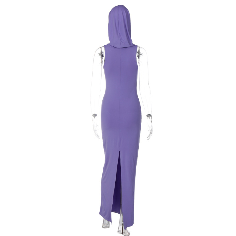 Women Clothing Summer Solid Color Hooded Back High Split Sleeveless Dress