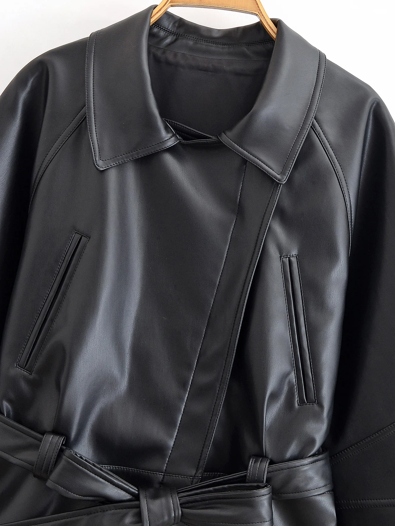 Women Vintage Faux Leather Belted Moto Trench Jacket