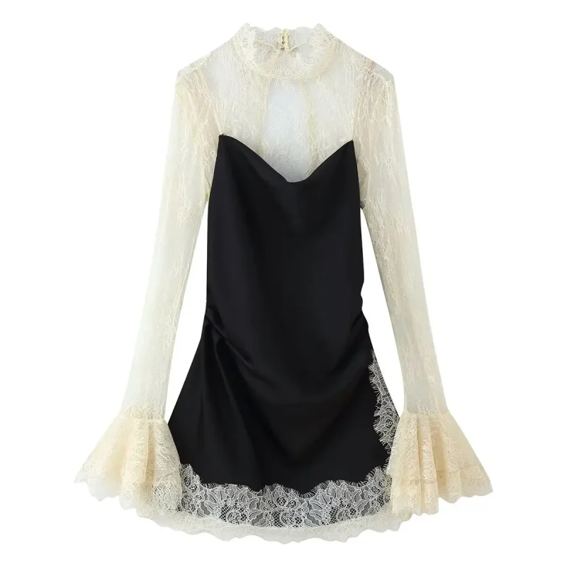 Women Vintage Lace Patchwork Slim Long Sleeve Mini Dress