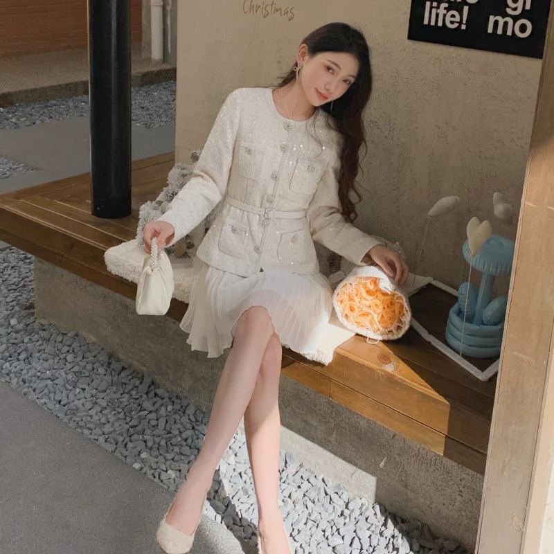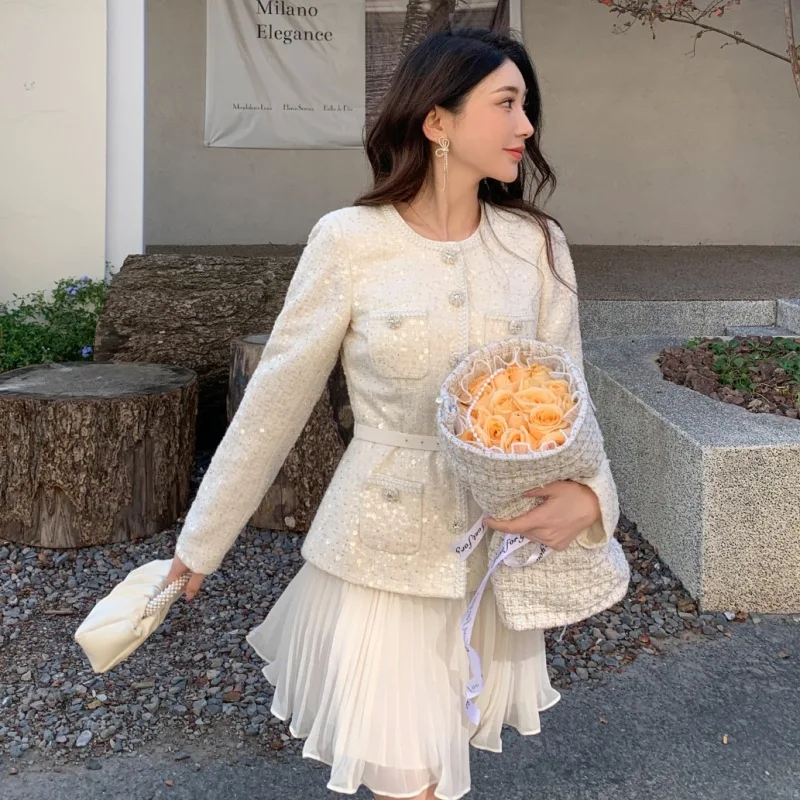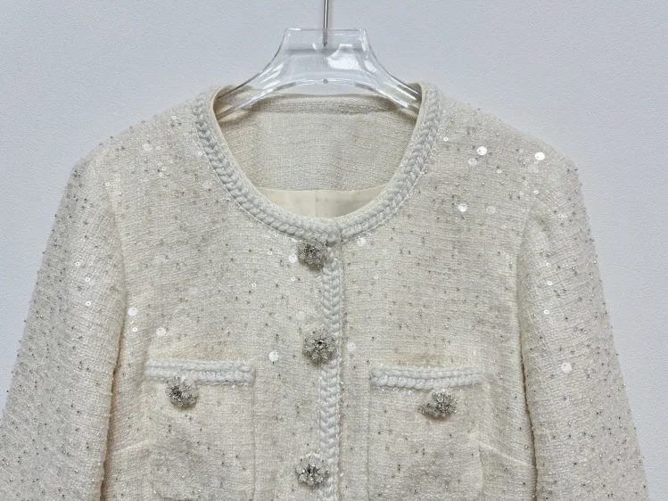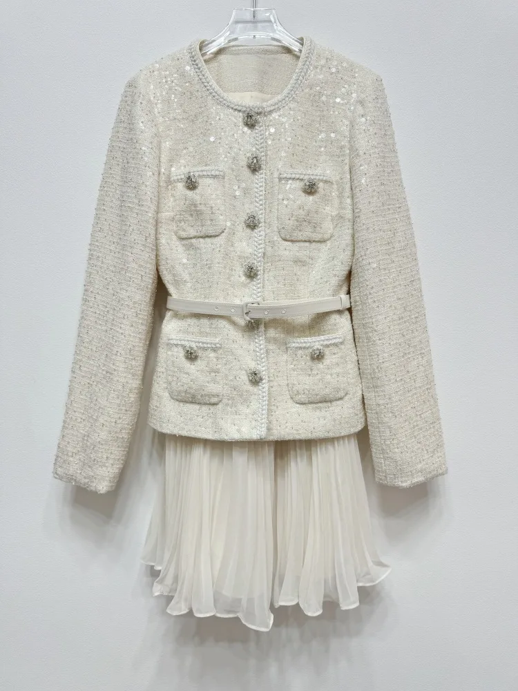 Women’s 2025 Beige Sequin Tweed Chiffon Dress