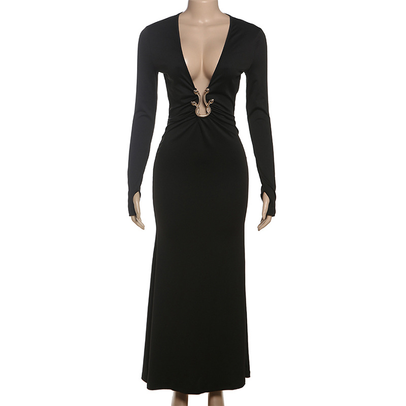 Women’s Autumn Solid Color Deep V Cutout Dress