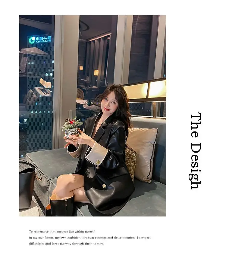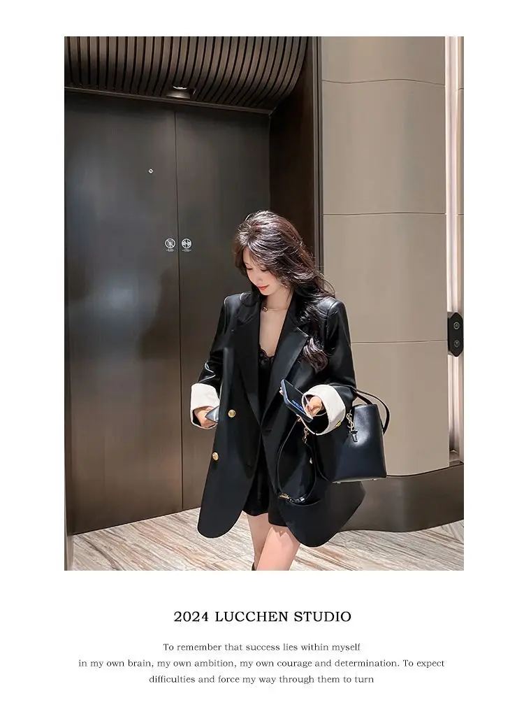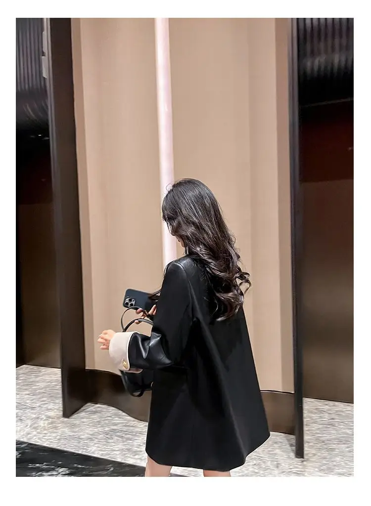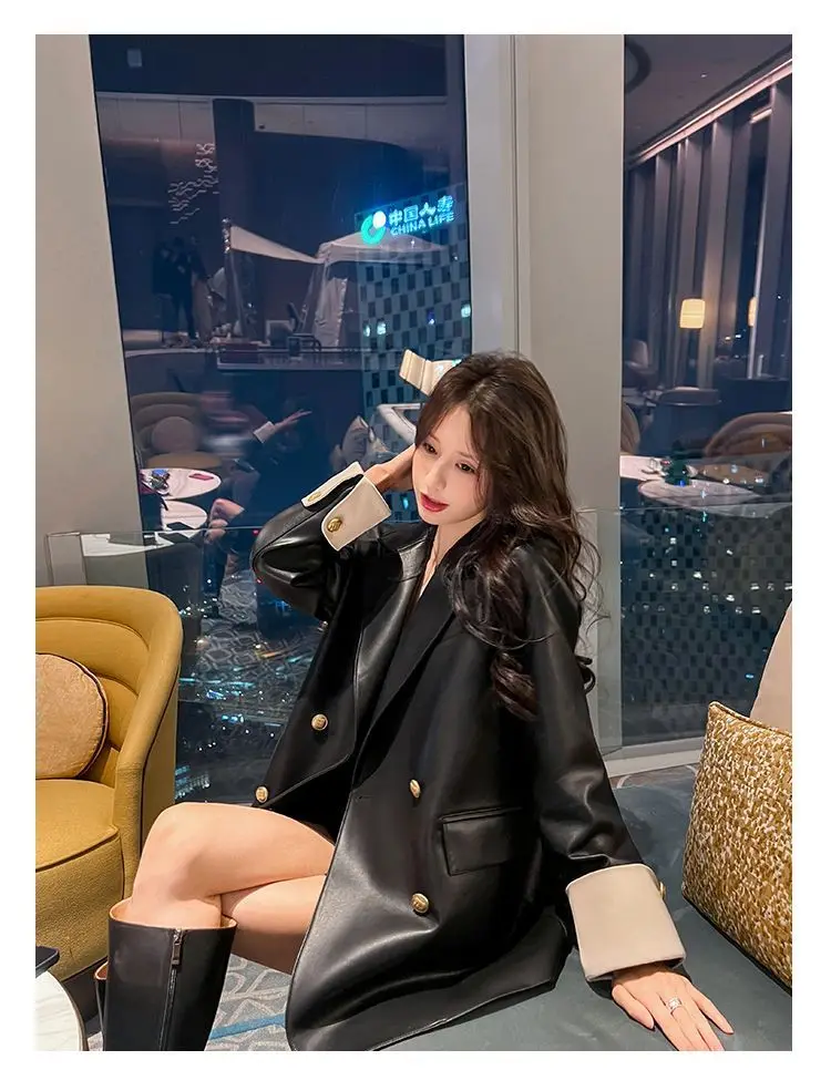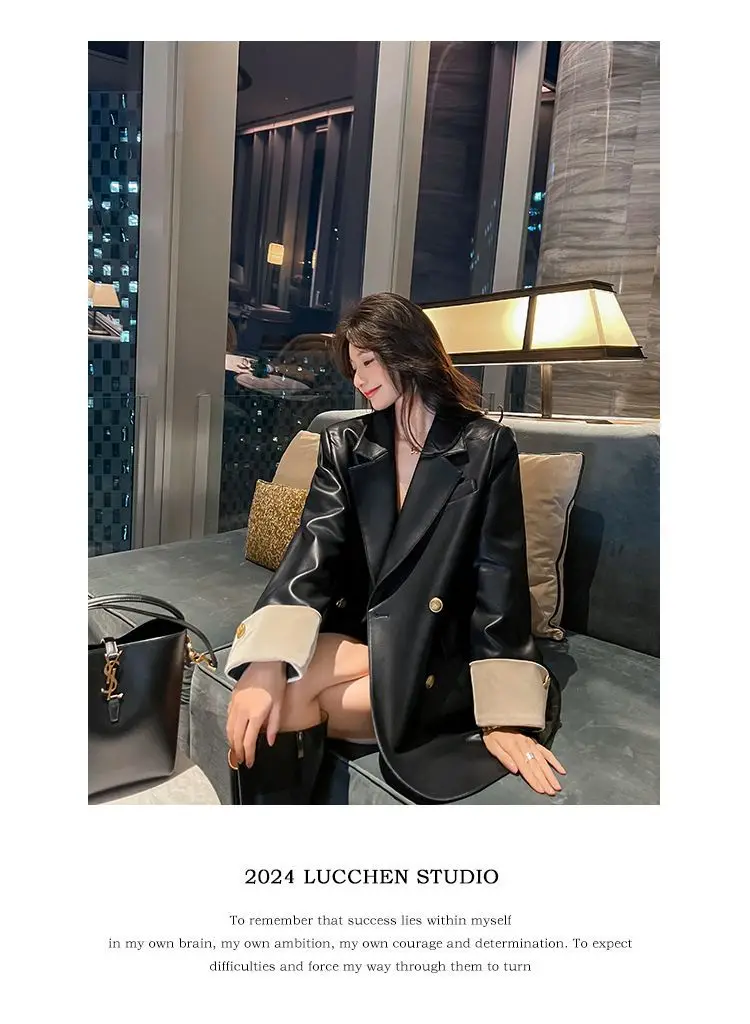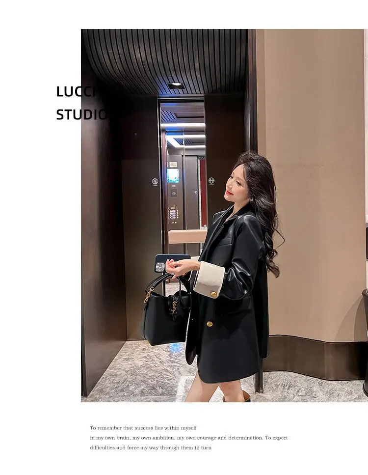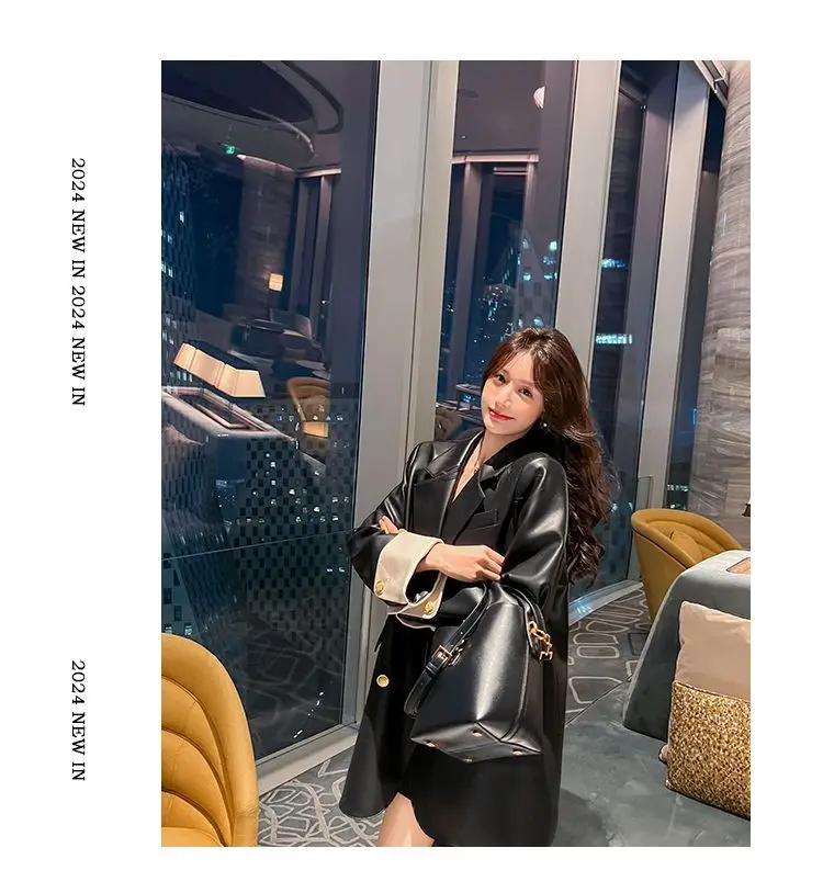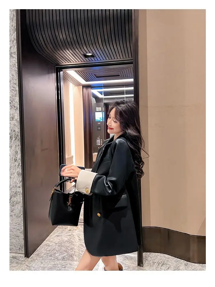 Women’s Black PU Leather Blazer Korean Spring Autumn Coat