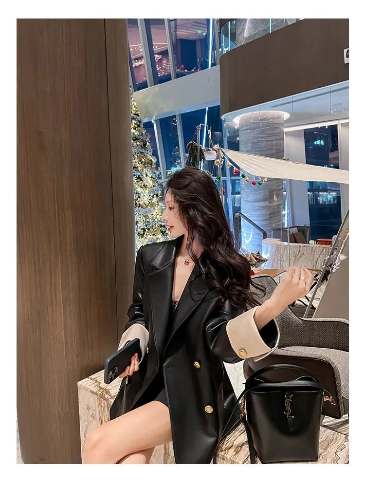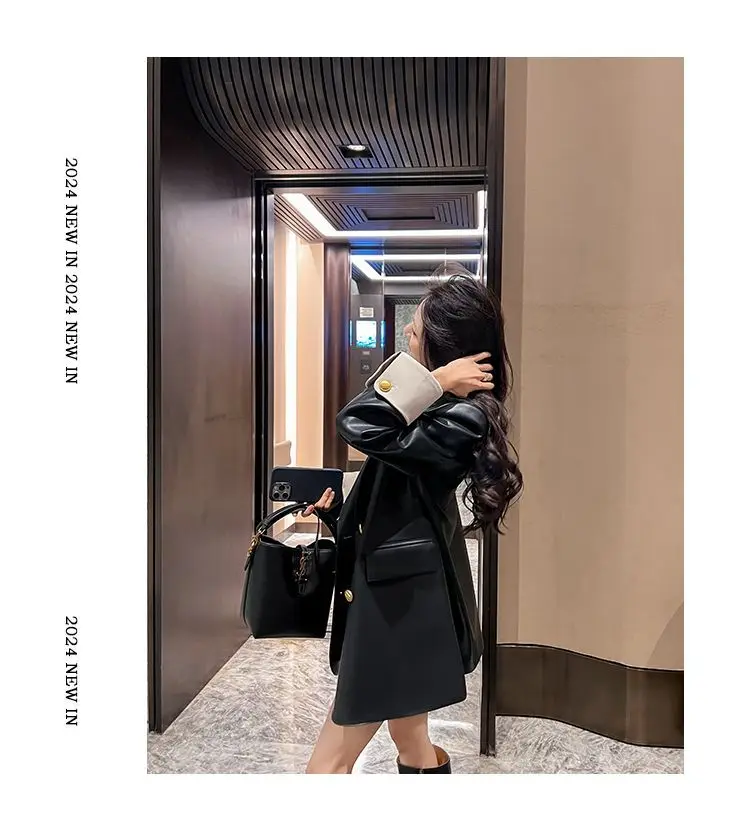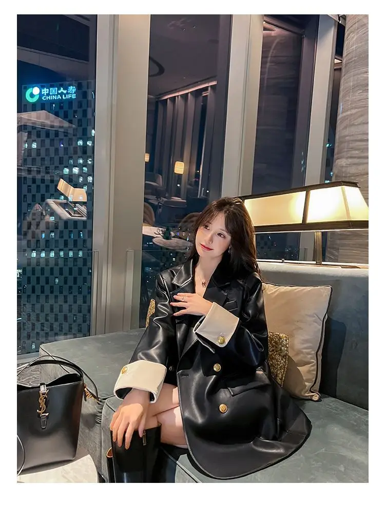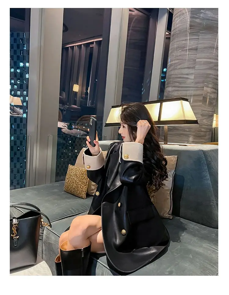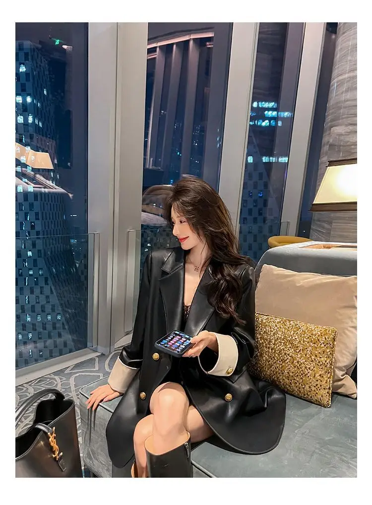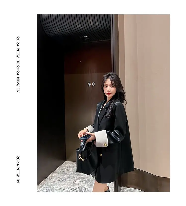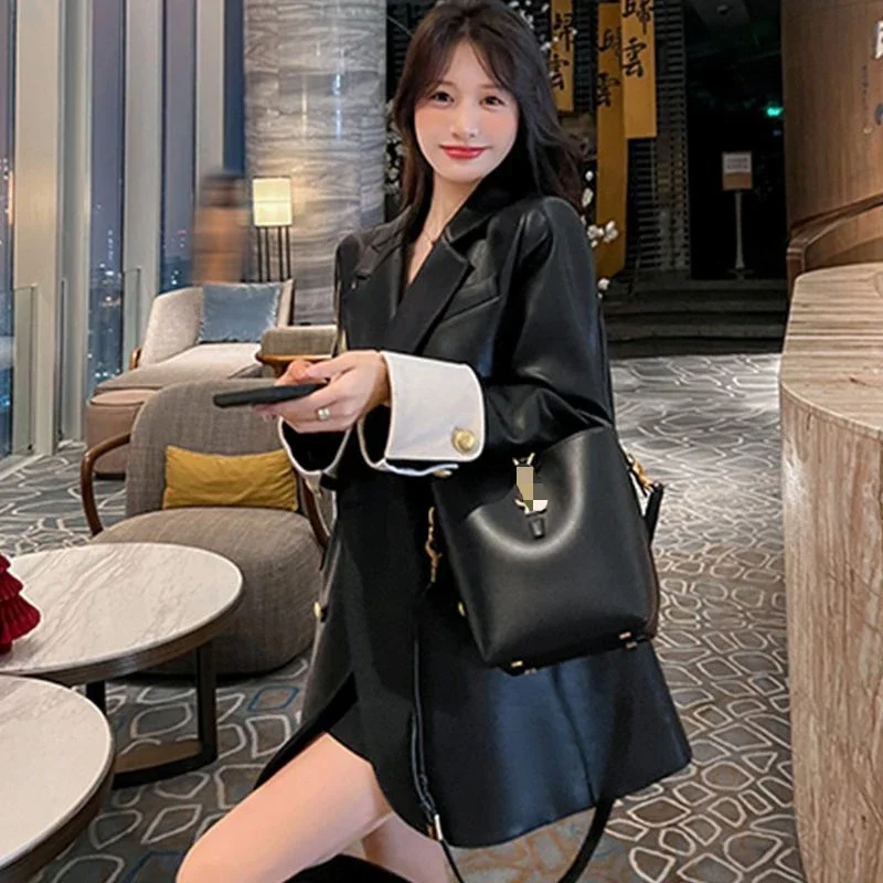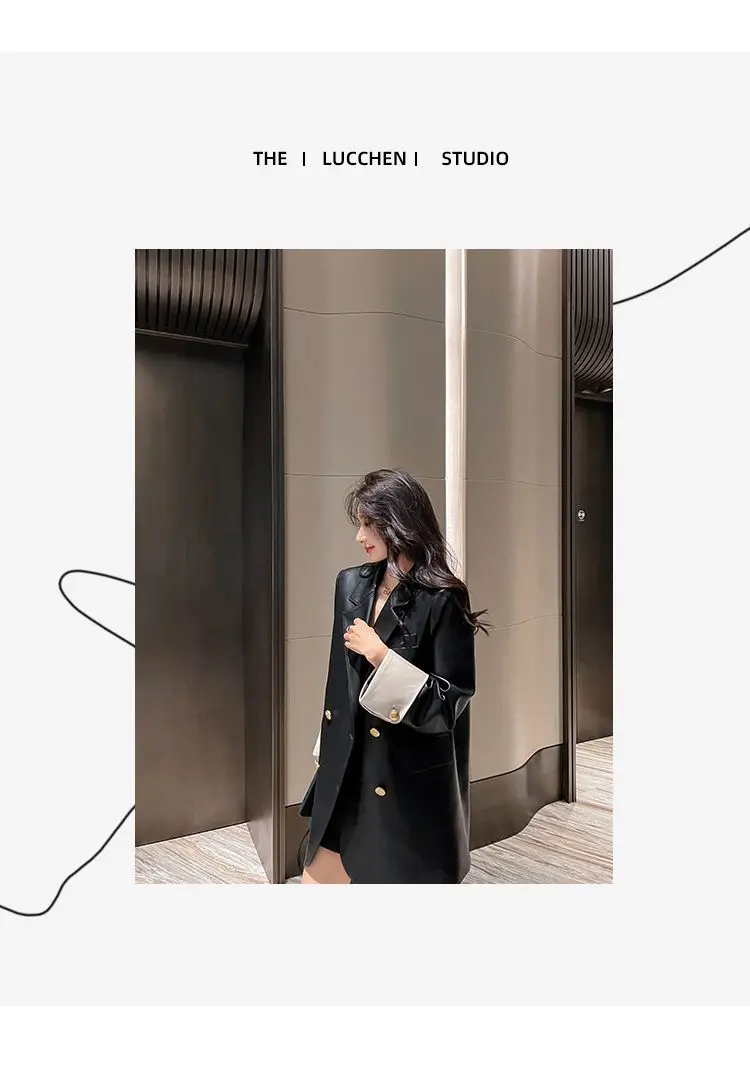 Women’s Black PU Leather Blazer Korean Spring Autumn Coat