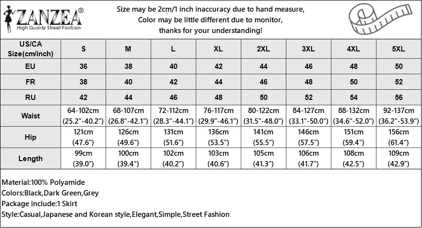 Material:100% Polyamide Colors:Black,Dark Green,Grey Package include:1 Skirt Cutting:Loose Stretch:Not Stretchable Length:Floor length Features:Has pocket,Elastic waist Pattern:Solid Thickness:Standard Style:Casual,Japanese and Korean style,Elegant,Simple,Street Fashion Season:Spring,Autumn Occasion:Daily,Simple,Casual Label: Yes Attention: 1. Due to different computers, there may be subtle color difference between the object and the image. Please don’t shoot if you mind. Thank you. 2. There may be manual measurement error of 1-3cm. Please understand the inconvenience. 3. Please refer to the real object. The model pictures are for reference only. 4. Attention!!! Please check the size chart carefully before ordering.”