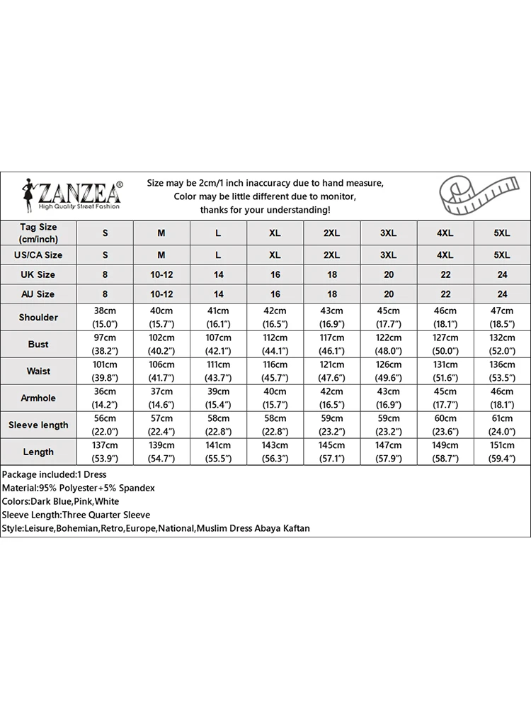 Material:95% Polyester+5% Spandex Colors:Dark Blue,Pink,White Sleeve Length:Three Quarter Sleeve Neckline:O-Neck Pattern:Floral Prints Length:Ankle Length Buckle chain:Button Down Front Thickness:Thin Features:Drawstring sleeves Style:Leisure,Bohemian,Retro,Europe,National,Muslim Dress Abaya Kaftan Season:Spring,Summer,Autumn,Winter Occasion:Family,Party,Beach,Wedding,Holiday,Employment Label: Yes Attentions: 1.The Real Object May Exist Slightly Colors Differences Compared To Images As Different Computers Display.Caution If Minding,Thanks. 2.There Might Be A Manual Measuring 1-3 cm Error.Sorry For Any Inconvenience. 3.Please Prevail On Real Item, Model Images For Reference Only. 4.Attention!!!Please check the size chart carefully before placing the order.
