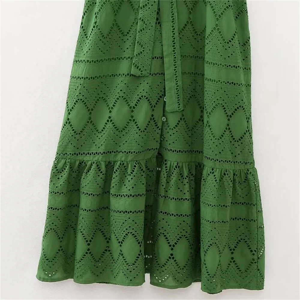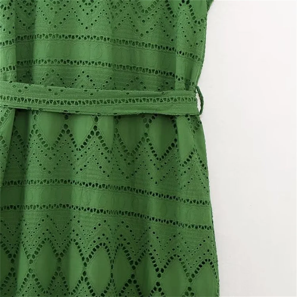 Women’s Lapel Hollow Embroidery Belted Dress
