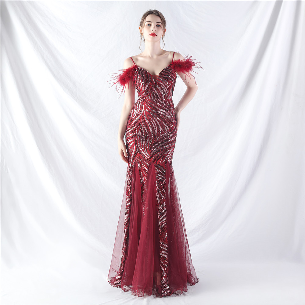 Women’s Ostrich Feather Sequin Mesh Evening Dress