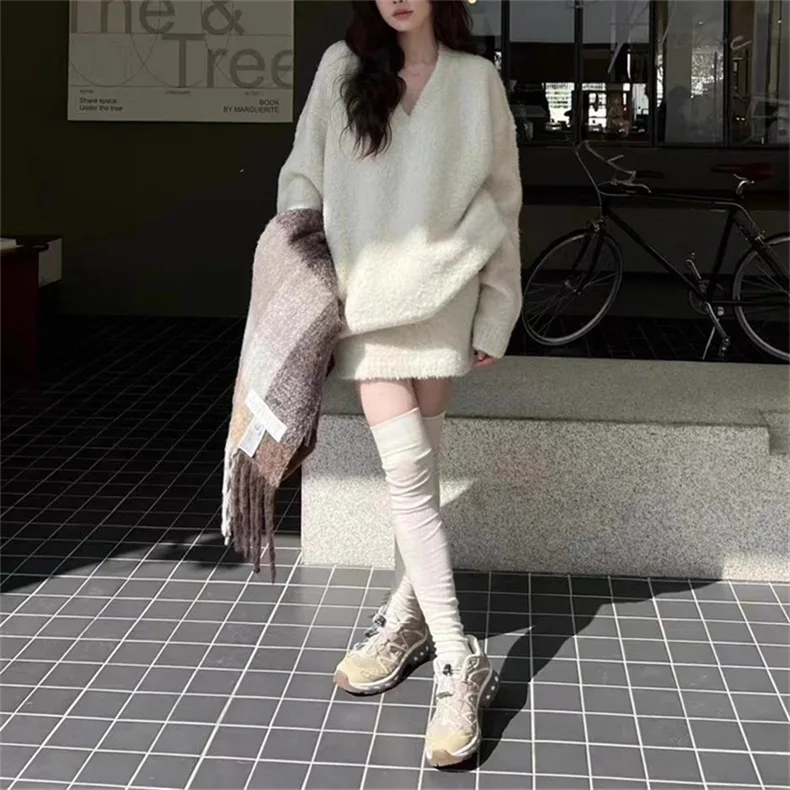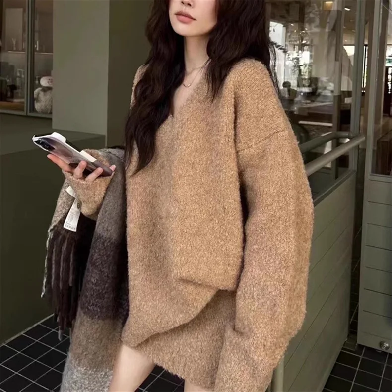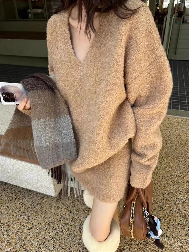 Women’s Oversized V Neck Knit Set Sweater and Skirt Two Piece