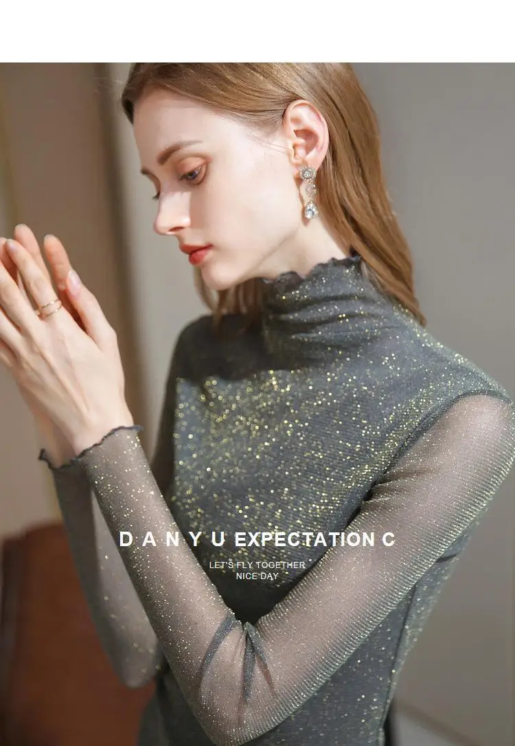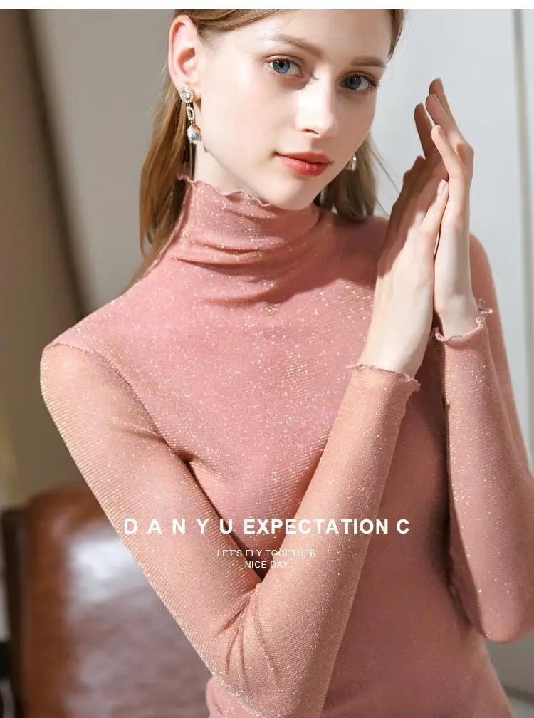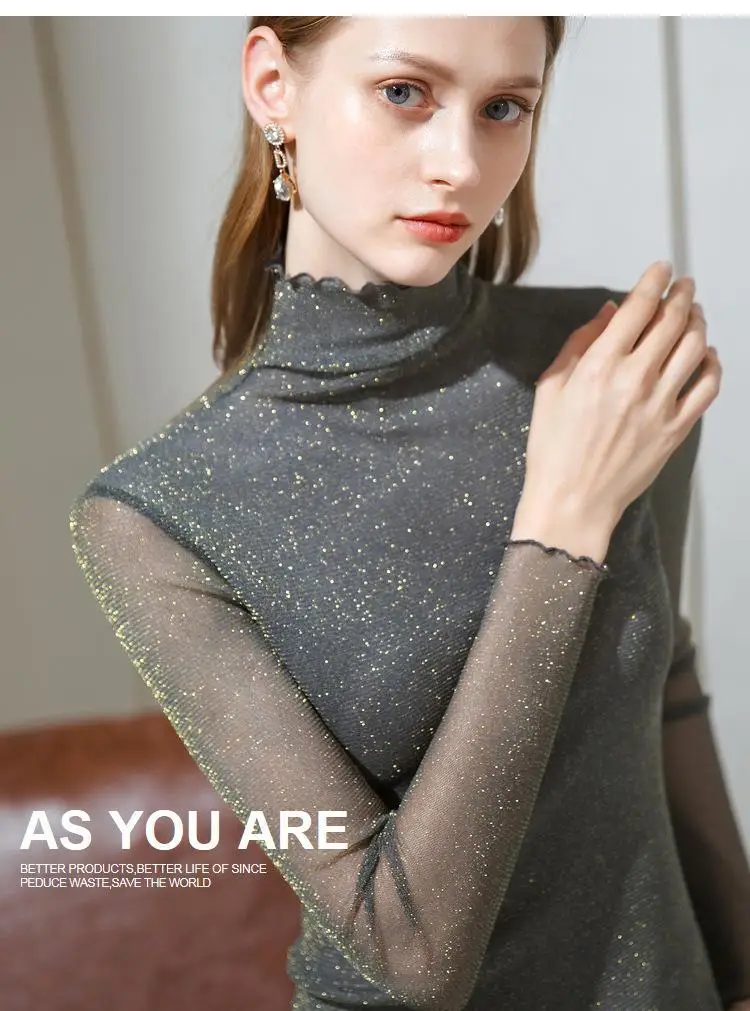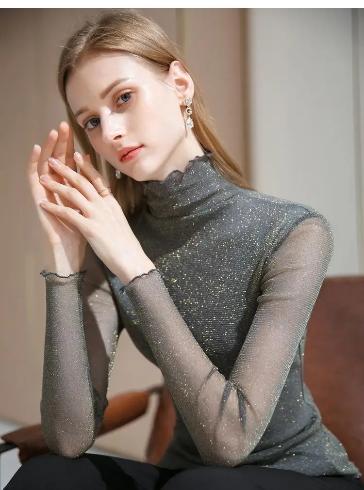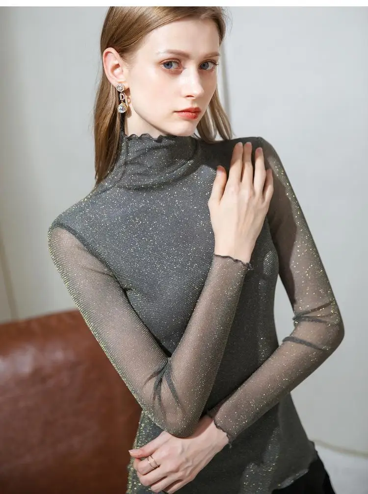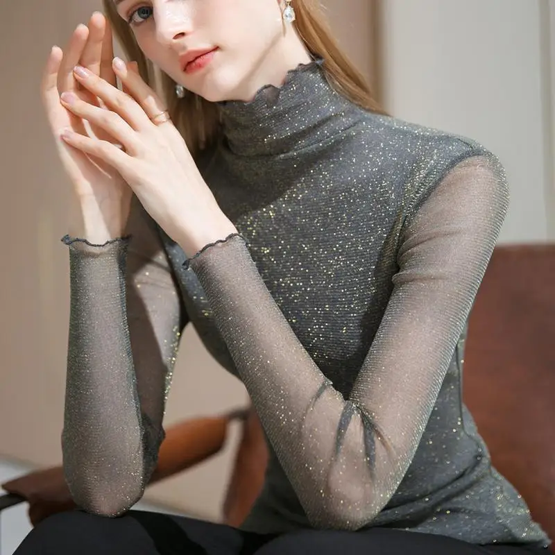 Women’s Sheer Mesh Lace Top Winter High Neck Blouse