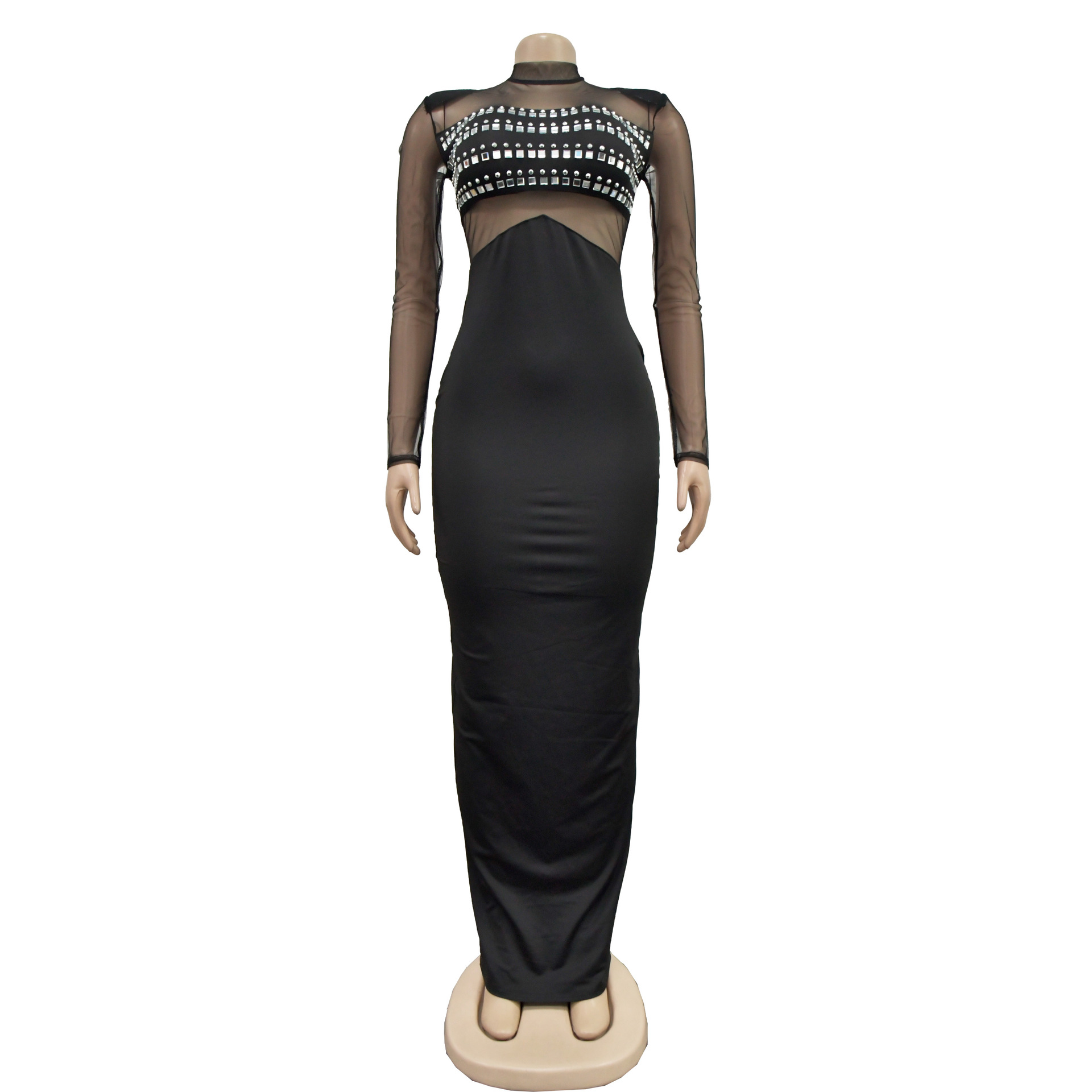 Women’s Solid Color Mesh Rhinestone Long Sleeve Dress