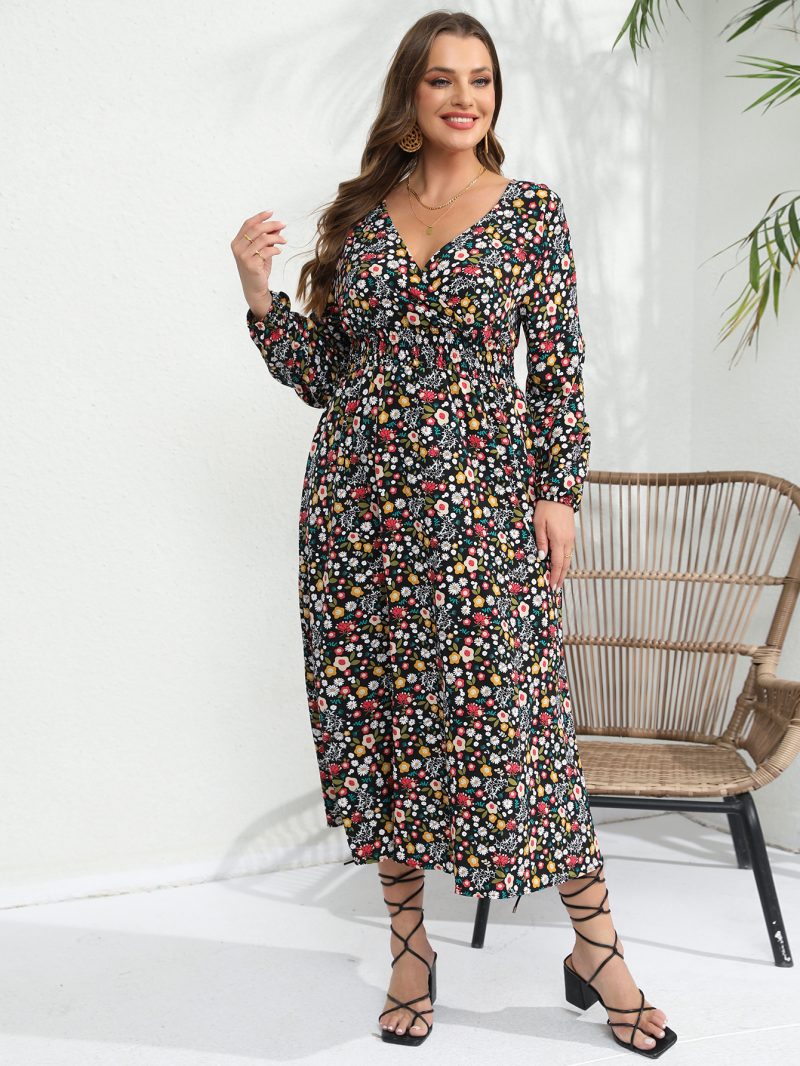 This elegant dress features a V-neck and long sleeves adorned with a beautiful floral print. Perfect for adding a touch of romance to your wardrobe, it’s ideal for both casual and semi-formal events, offering a blend of style and comfort.