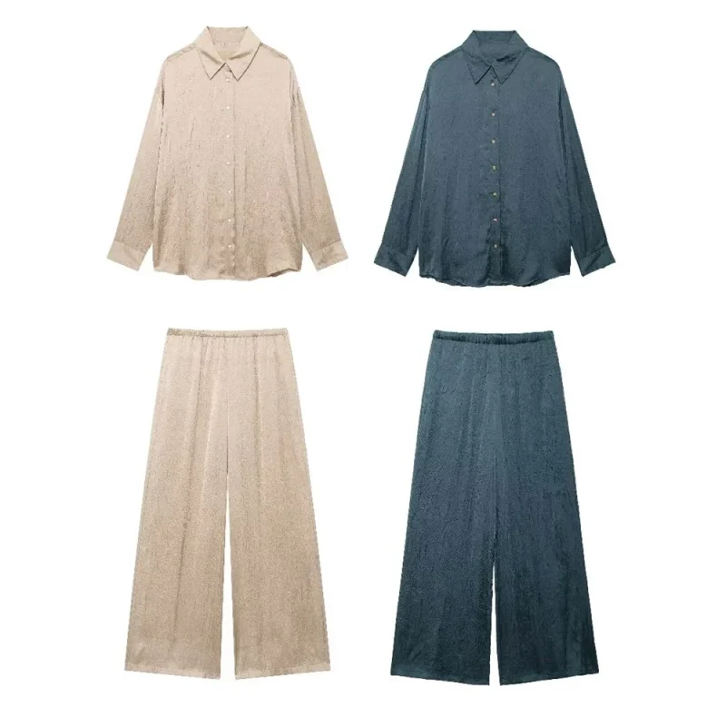 Wrinkle-Effect Silk Shirt with Casual Pants Set